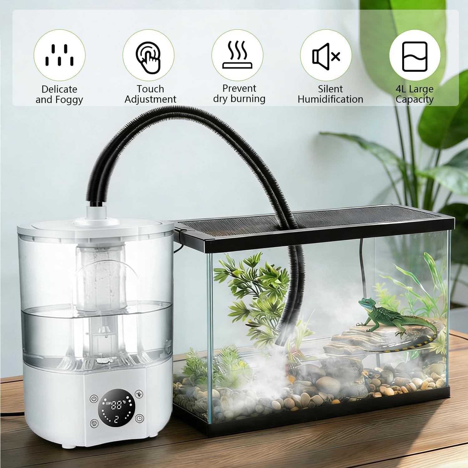 Ultra-leise: Unser Terrarienbefeuchter verfügt über eine Knopfsteuerung und ein leises Design, das während des Betriebs geräuschlos ist und die Gesundheit Ihrer Haustiere nicht beeinträchtigt. Sie können die Nebelmenge stufenlos einstellen. Wenn sich kein Wasser im Wassertank befindet, schaltet sich das Gerät automatisch ab und stoppt den Betrieb, um Ihre Stromsicherheit zu gewährleisten.