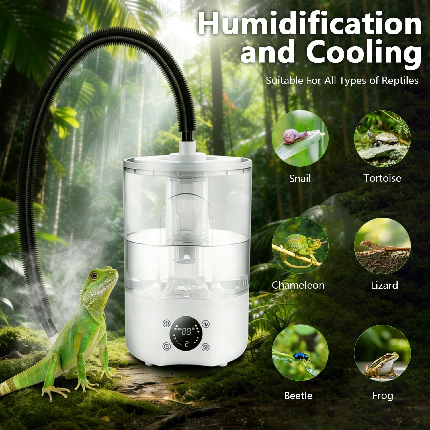 Zeitfunktion: Der Reptilienbefeuchter Terrarium verfügt über eine Zeitfunktion. Sie können die gewünschte Zeit direkt am Gerät einstellen. Die Zeit ist von 2 bis 8 Stunden einstellbar. Das Gerät eignet sich für verschiedene Reptilien wie Eidechsen, Landschildkröten, Schlangen, Wasserschildkröten, Chamäleons, Frösche usw.