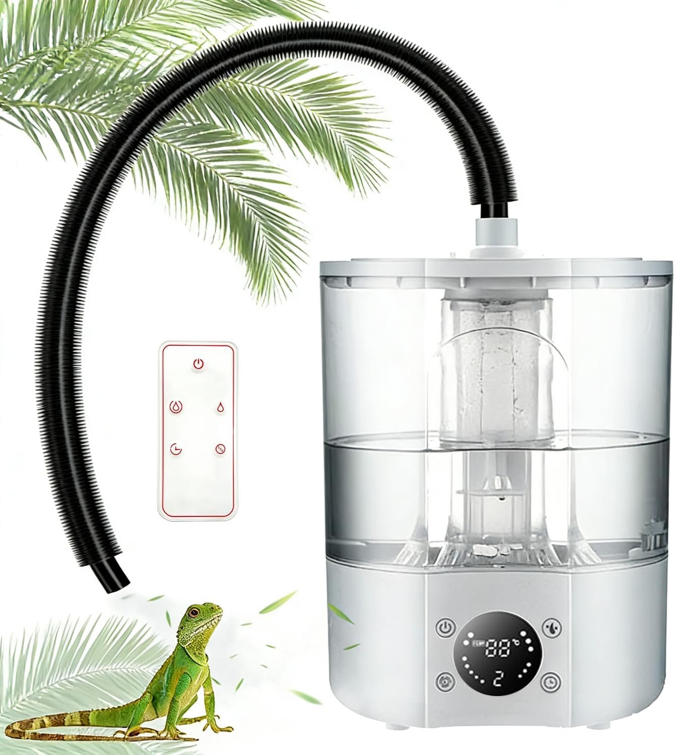 4-Liter-Tank mit breiter Öffnung: fasst 4 Liter Wasser und reicht für ca. 48 Stunden. Ausreichend für die meisten Reptilien. Die 7 cm große Öffnung ermöglicht ein schnelles Nachfüllen und Reinigen. Inklusive 2 m Schlauch, Saugnäpfen und Infrarot-Fernbedienung. Perfekt als Reptilienbefeuchter für Terrarien.