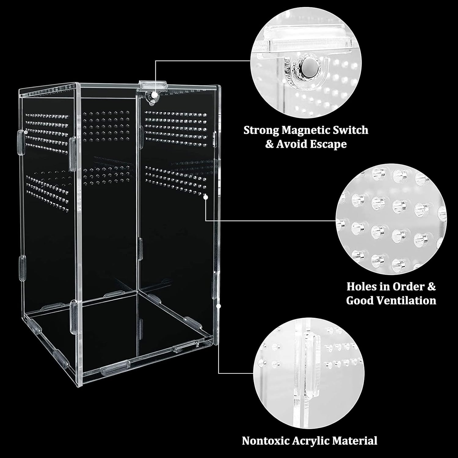 【Schnell und einfach zu montieren】: Einfach die Reptilienzuchtbox zusammenfügen und dann den mitgelieferten Gummiring verwenden, um die Schnittstelle für eine einfache Installation zu sichern. Der starke Magnetschalter an der Oberseite erleichtert nicht nur das Füttern von Haustieren, sondern verhindert auch wirksam deren Flucht.