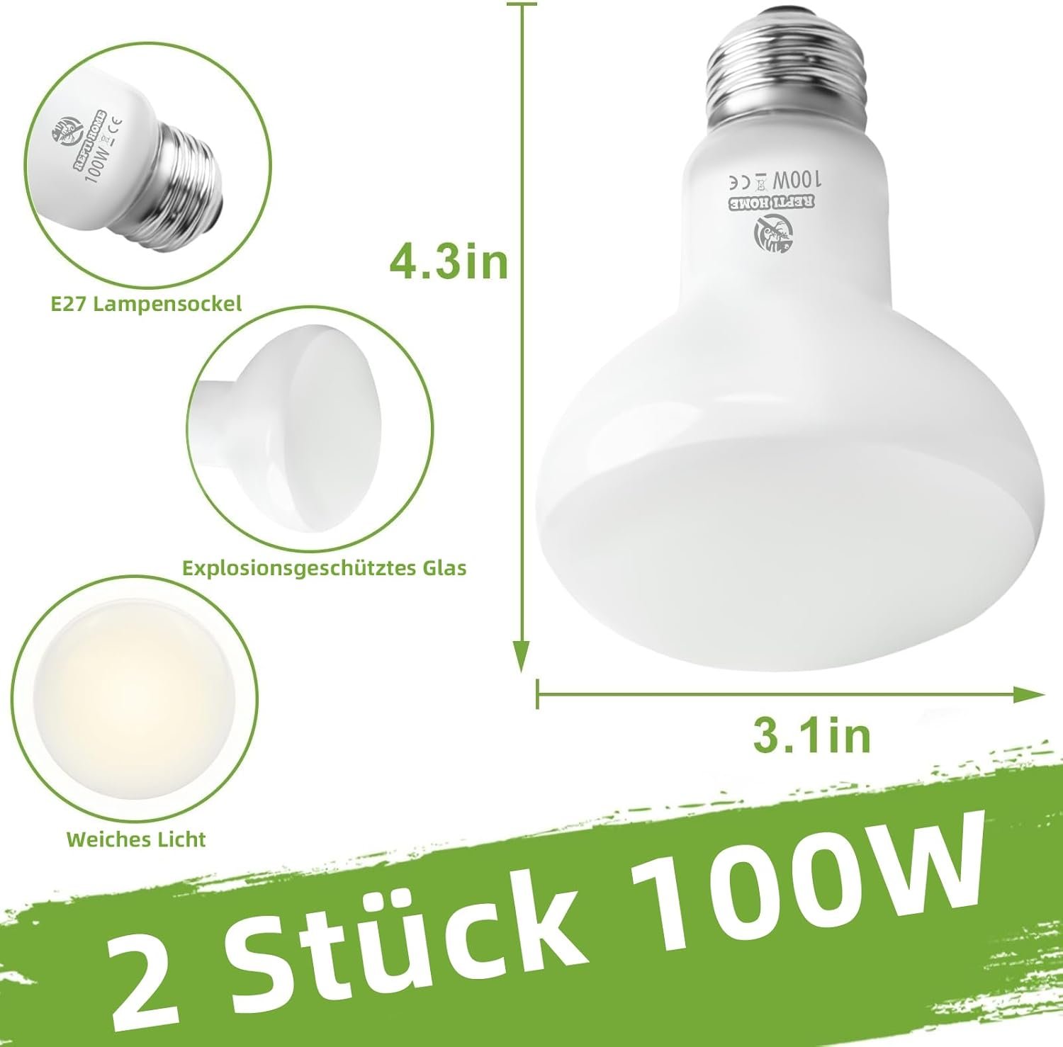 Verwendungsstandard: Jedes Produkt enthält 2 Packungen 100-Watt-Reptilien-Wärmelichter in einer Box, die andere Glühbirne kann als Ersatz oder Ersatz verwendet werden, und die Heizbirne kann 2.000 bis 3.000 Stunden lang verwendet werden. Es wird empfohlen, das Wärmelicht 4–6 Stunden am Tag zu verwenden und alle 3 Monate auszutauschen. Halten Sie einen Abstand von mindestens 30 cm zu Reptilien ein und halten Sie die Oberfläche der Zwiebel trocken und fern von Wasser.