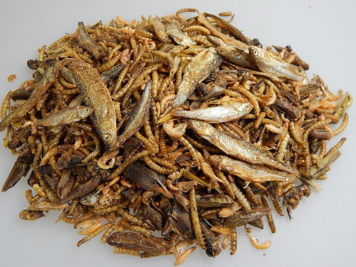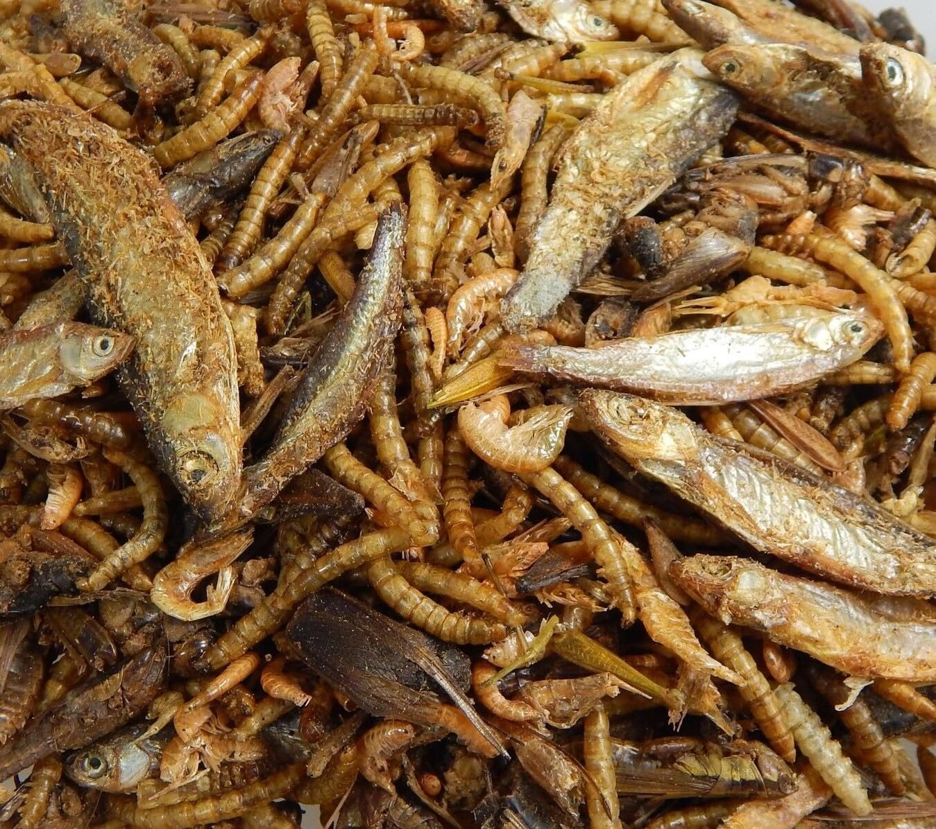 Hochwertige 6-Sorten-Mischung für Reptilien, Vögel und Fische bestehend aus: Bachflohkrabben, Süßwassergarnelen, Mehlwürmer, Heuschrecken, Grillen und Trockenfisch (3-6 cm) 100 % Naturprodukt getrocknetes Naturfutter ohne Konservierungsstoffe Ergänzungsfutter für Koi, Goldfische, Schildkröten, Vögel, Reptilien und große Buntbarsche. Getrocknetes Naturfutter ohne Konservierungsstoffe. Verpackt in einer praktischen Tasche. Wird auch zur Winterfütterung von Vögeln als Insektenfutter verwendet. Zutaten: Rohprotein: 65,2 % Rohasche: 14,7 % Rohfett: 17,2 % Rohfaser: 7,9 %