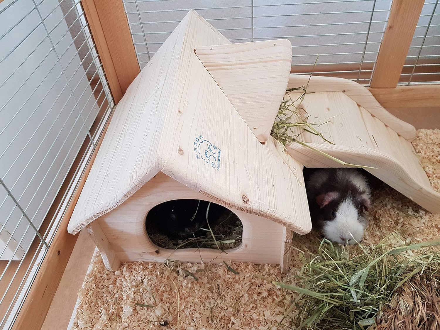 Ideal für Meerschweinchen, Degus, Ratten und Zwergkaninchen. Mit 2 großen Eingängen im Erdgeschoss, sowie einem großen Eingang im Obergeschoss. Mit breiten, flachen Treppen. Im einzigartigen Softline-Design. Sorgfältig verarbeitet. Ein Naturprodukt aus garantiert unbehandeltem Fichtenholz. „Handmade“ Ein Marken- und mustergeschütztes Qualitätsprodukt aus Österreich. Bei Verwendung im Außenbereich empfiehlt es sich, das Holz zu behandeln, um es vor Feuchtigkeit zu schützen. (z. B. Bienenwachsbeize oder Spielzeugfarbe, da diese bedenkenlos angeknabbert werden können).