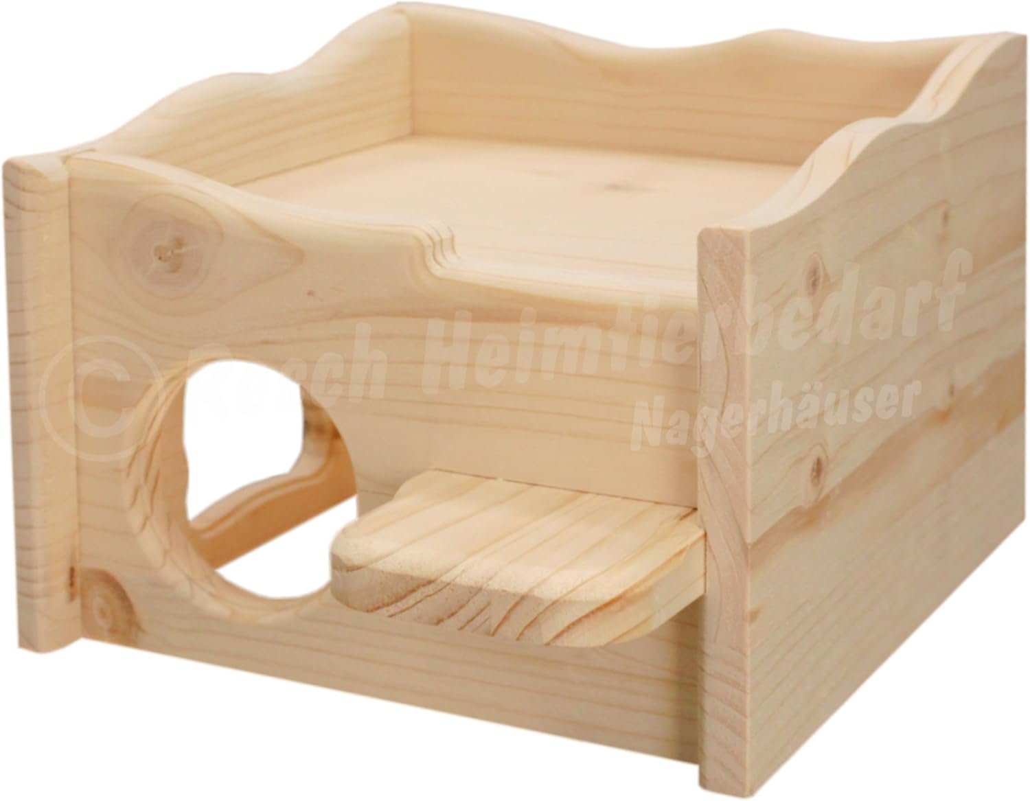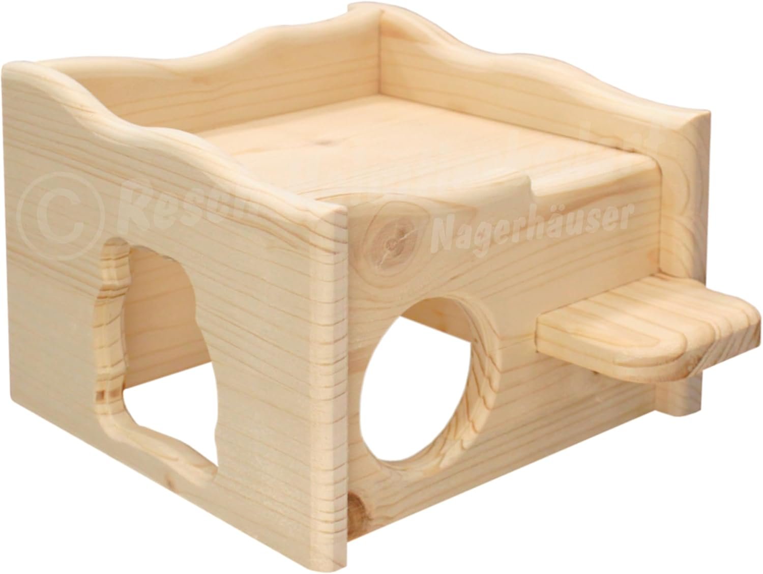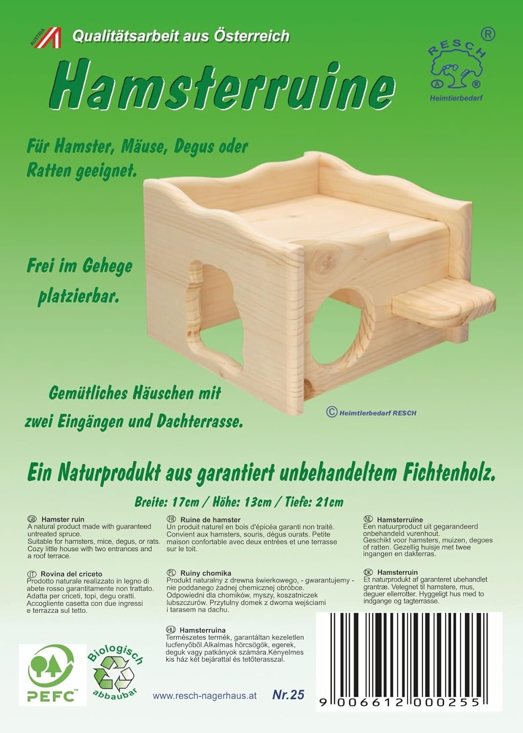 Die Hamsterruine ist bereits montiert. Es besteht aus massivem Fichtenholz, da dieses Material keine Schadstoffe enthält und zu 100 % biologisch abbaubar ist. Es kann auch bedenkenlos an Ihrem Haustier geknabbert werden. Alle unsere Nagerhäuser sind verklebt und wurden mit ca. 19 mm kleine Nägel. Diese lassen sich nicht vermeiden und dienen lediglich der Stabilität bis zum Aushärten des Klebers. Allerdings wird mit den Nägeln sehr sparsam umgegangen, da der Kleber die wesentliche Stabilität des Hauses erhält. In den letzten Jahrzehnten, in denen wir unsere Nagerhäuser produzieren, ist uns noch kein Fall bekannt geworden, dass es dadurch zu Verletzungen gekommen ist
