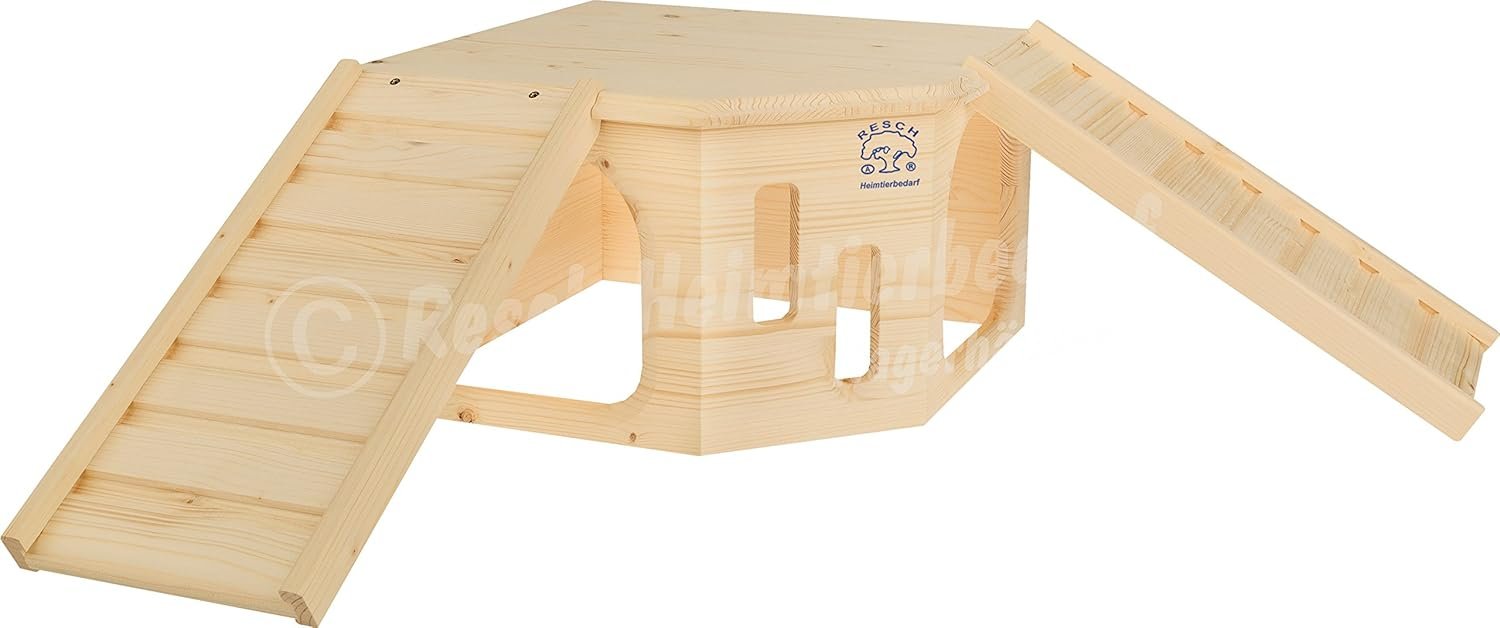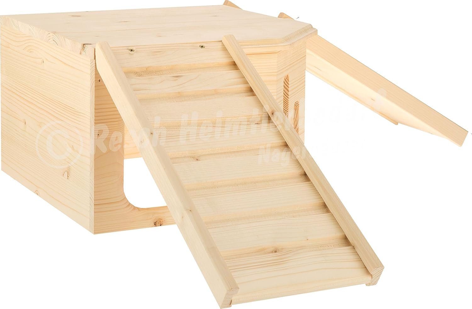Tierart: KleintiereArtikelgewicht: 1,95 kg. Produktabmessungen: 60,5 x 60,5 x 20 cm. Maße des linken Eingangs: 14 x 14 cm (B x H). Maße des rechten Eingangs: 14 x 14 cm (B x H). Dachmaße: 33 x 33 cm (L x B). Maße der Treppe: ca. 34 x 16 cm (L x B). Materialzusammensetzung: 100 % Fichtenholz. Außenmaterial: Fichtenholz. Dicke: 12 MillimeterProduktmenge: 1