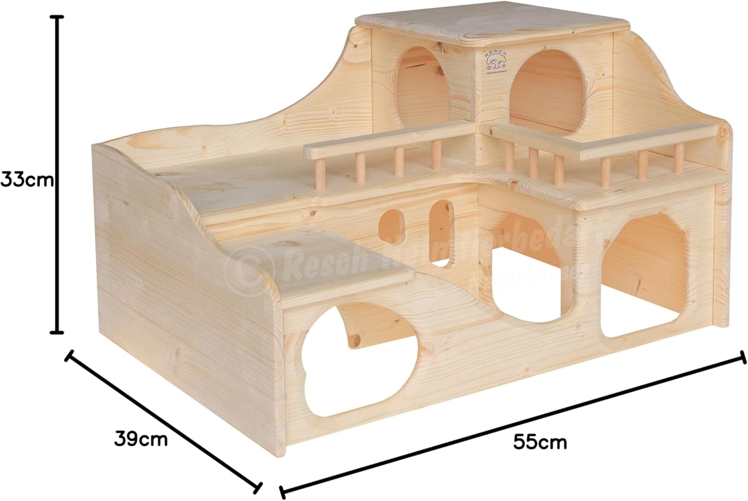 Tierart: Meerschweinchen, Zwergkaninchen, Degus und RattenArtikelgewicht: 3,84 kgProduktabmessungen: 55 x 39 x 33 cm (LxBxH)Maße Eingänge unten: Ca. 12 x 13 cmMaße Eingänge oben: Ca. 11 x11 cmAufgangsbreite Treppe: 15 cmMaße Haus oben: 22 x 23 cmMaße Balkon: 14 x 16cmHerstellerreferenz: Resch 35Material-Zusammensetzung: 100% Fichtenholz / „Geländerstäbe“ –>100% Buchenholz Außenmaterial: FichtenholzStärke:12 MillimeterProduktanzahl: 1