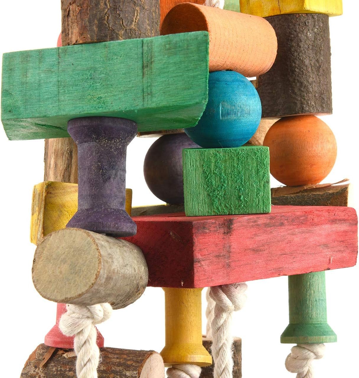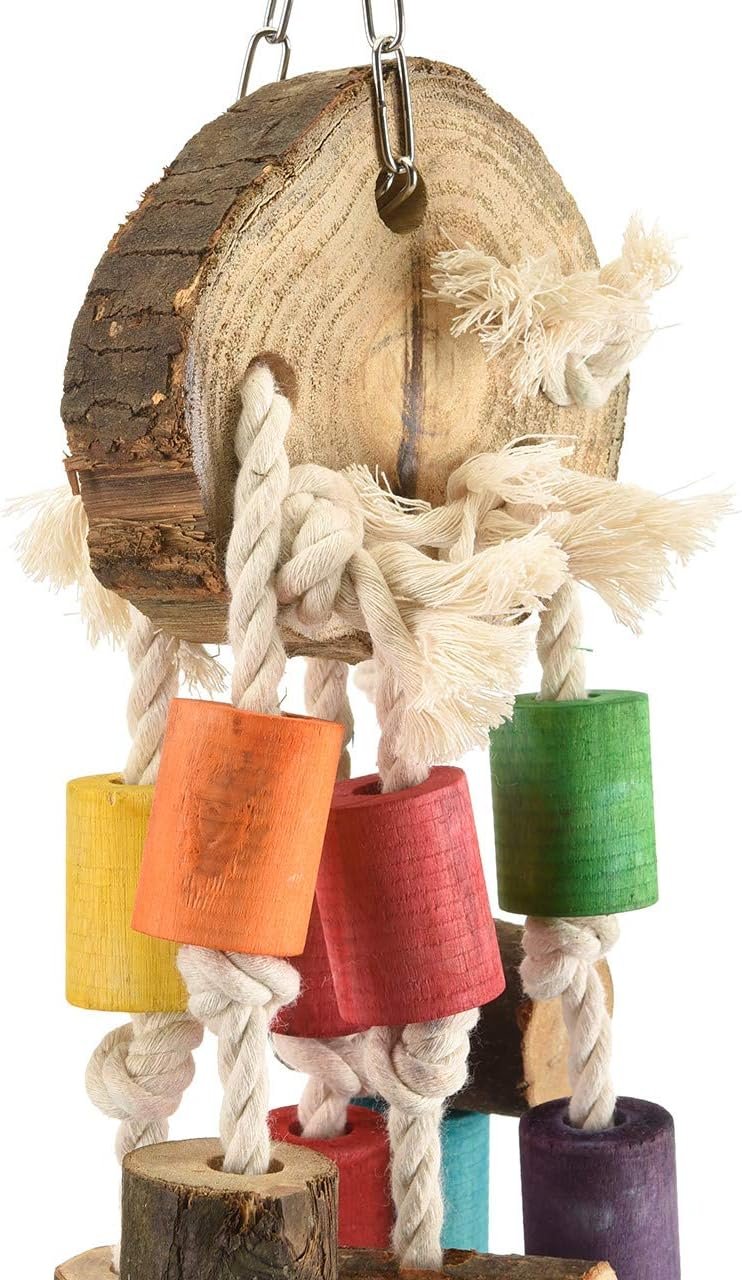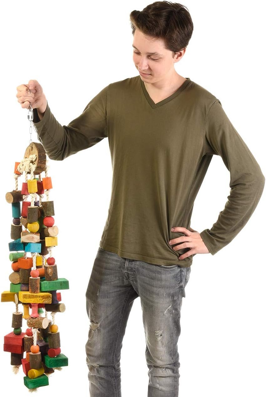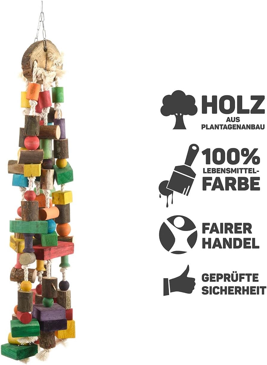 Ein wirklich großes Papageienspielzeug ist der Giant Giggle mit einer Höhe von fast 90 cm. Echtholz, bunte Holzklötze sowie Holzkugeln und Baumwollseile machen das Spielzeug für alle großen Papageien wirklich interessant. Dieses Spielzeug wurde mit Lebensmittelfarbe gefärbt.