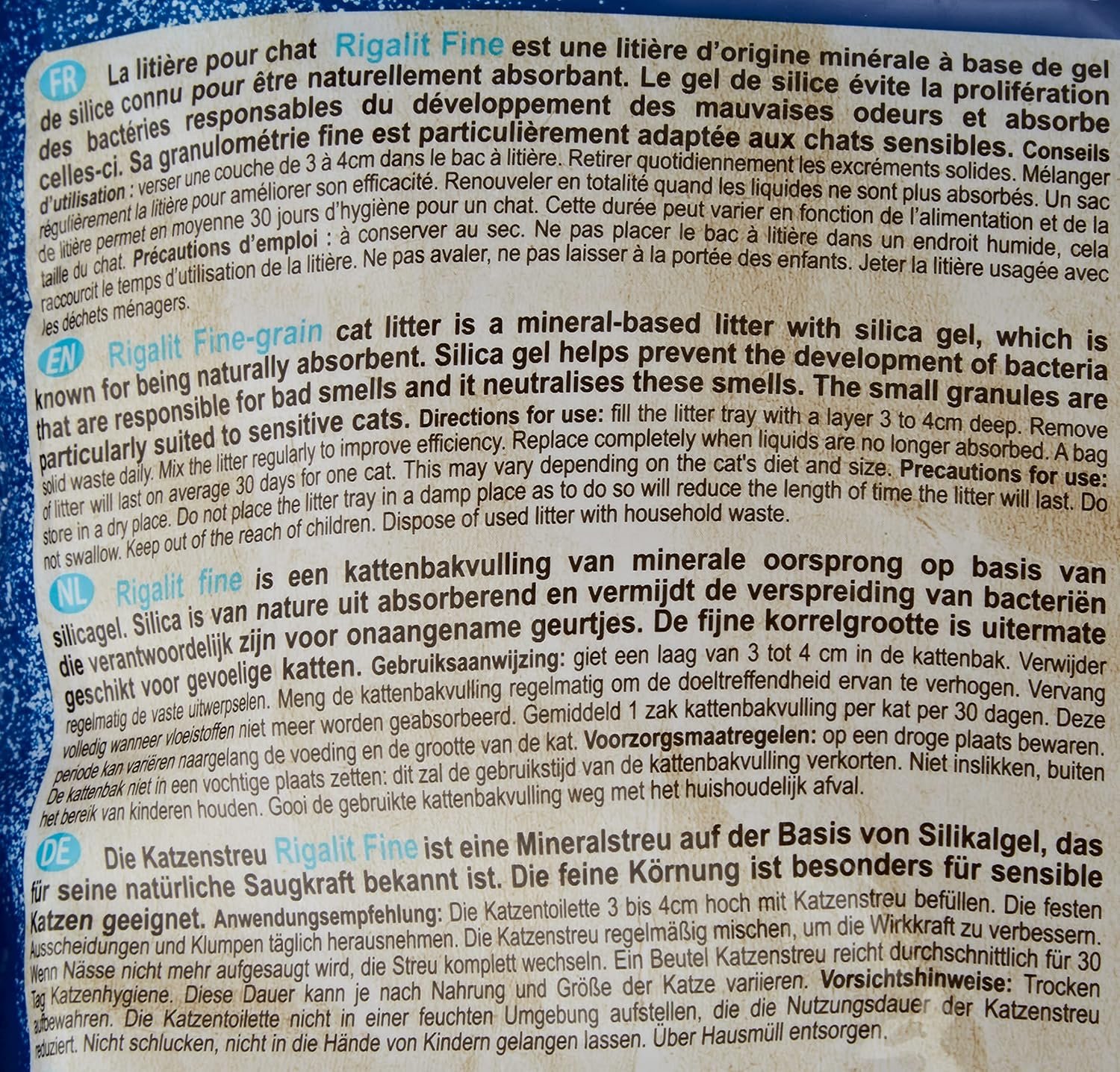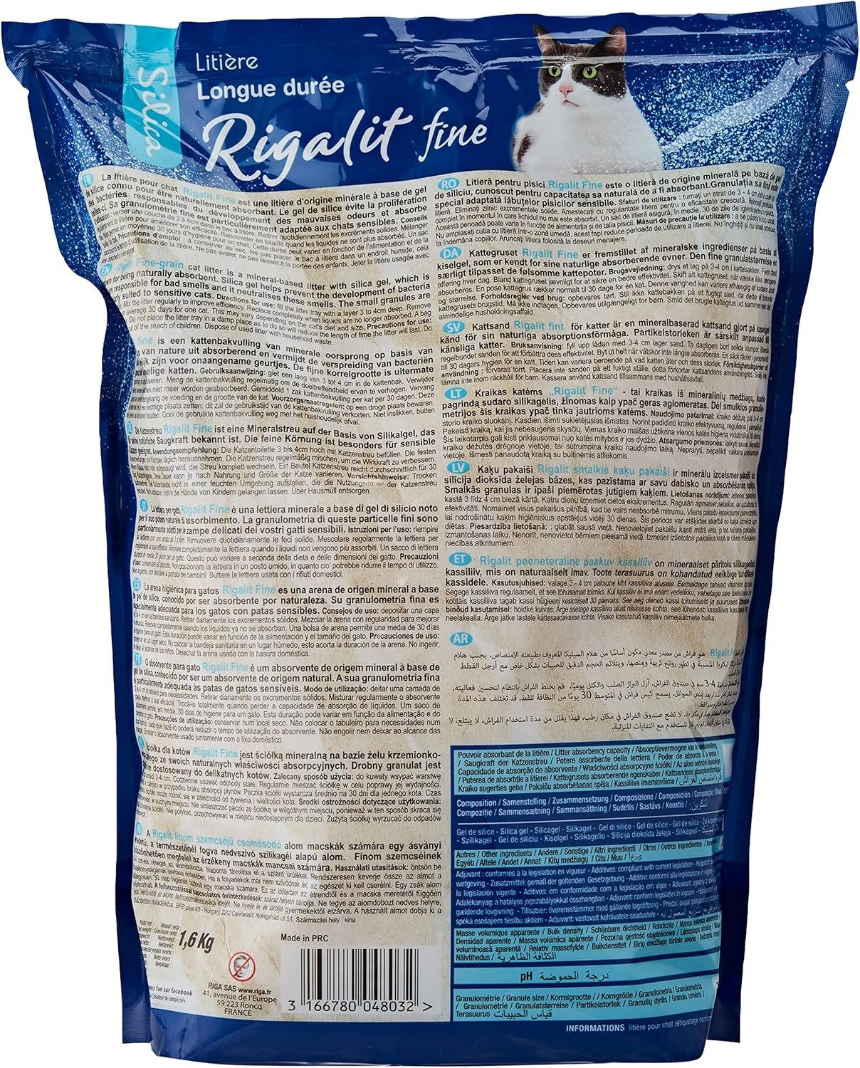 HYPERABSORBIERENDES KATZENSTREU: Rigalit feinkörnig ist ein Katzenstreu mineralischen Ursprungs auf Basis von Kieselgel, das für seine hohe Saugfähigkeit bekannt ist. Diese Bettwäsche hat eine außergewöhnlich hohe Absorptionsrate (190 %). Ideal zum Aufsaugen von Flüssigkeiten und Feuchtigkeit.