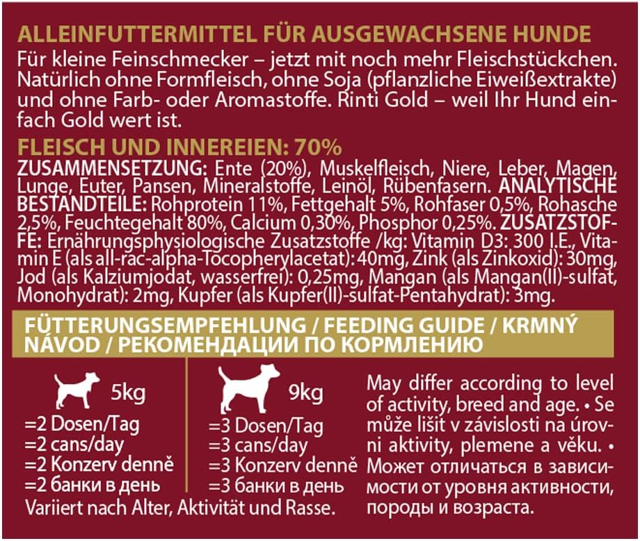 Für kleine Feinschmecker – jetzt mit noch mehr Fleischstücken. Natürlich ohne Formfleisch, ohne Soja (pflanzliche Eiweißextrakte) und ohne Farb- und Aromastoffe. Rinti Gold – weil Ihr Hund einfach Gold wert ist.