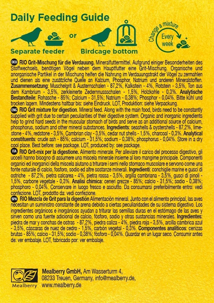 Unterstützt die Verdauung – der Vogelgrit von Rio enthält wichtige Schleifstoffe, die Vögeln dabei helfen können, ihre Nahrung effizient zu zerkleinern und zu verdauen