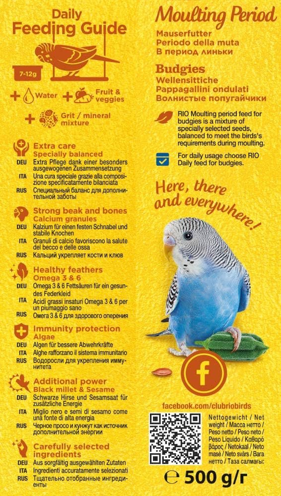 RIO Alleinfuttermittel für Wellensittiche. Mauserfutter ist eine ausgewogene Getreidemischung, die speziell auf die Bedürfnisse von Vögeln während der Mauser abgestimmt ist. Der erhöhte Gehalt an Proteinen und Fetten kann dazu beitragen, den Prozess des Federwechsels zu erleichtern.
