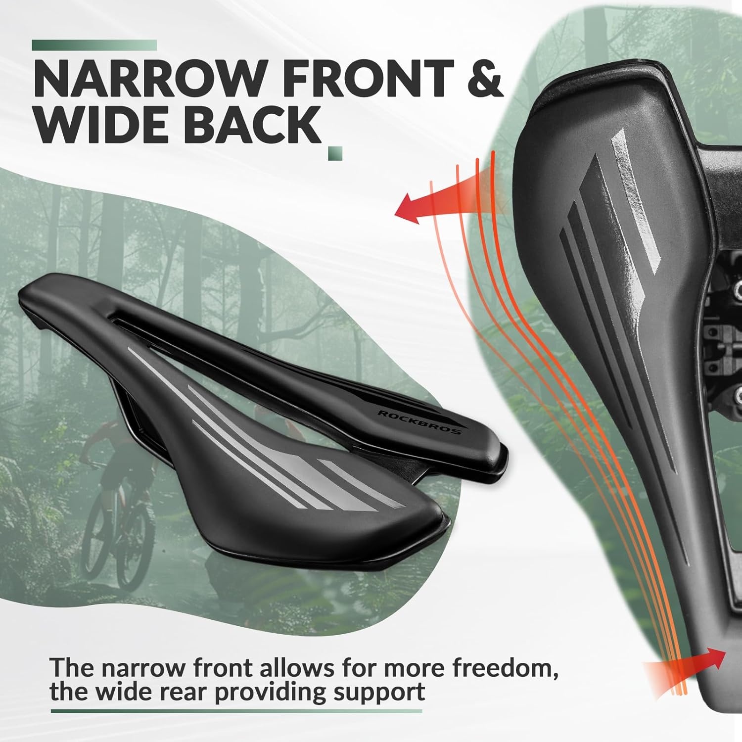 Reibung verhindern und entspannen: Der Rennradsattel ist vorne schmal und hinten breit. Der vordere Teil des Sattels verhindert Reibung an den Beinen beim Reiten. Der breite hintere Teil des Fahrradsattels bietet mehr Halt für die Hüften, was den Druck auf die Hüften verringert und eine entspanntere Fahrt ermöglicht.