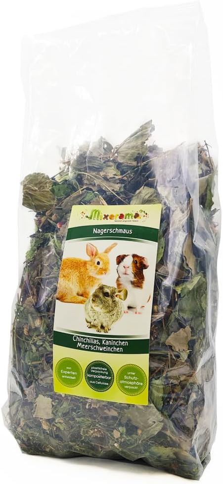 Das Nagerschmaus ist eine natürliche Kräuter- und Blattmischung für Kaninchen, Meerschweinchen und Chinchillas. Die vielfältigen Kräuter sind die Grundlage für eine gesunde und artgerechte Ernährung. Das angenehm lockere Futter ist frei von getrocknetem Gemüse und Hülsenfrüchten. Grobe Pflanzenbestandteile, wie zum Beispiel Löwenzahnwurzel, fördern den natürlichen Zahnabrieb. Neben heimischen Fruchtblättern sind auch Kräuter und Unkräuter enthalten. Die Stängel von Koriander, Kerbel und Sellerie sind reich an Mineralien und wichtigen Spurenelementen. Pfefferminzblätter sollen krampflösend wirken und den Gallenfluss fördern. Darüber hinaus werden der Pfefferminze antimikrobielle, antivirale und harntreibende Wirkungen zugeschrieben. Auch die aromatischen Blätter werden gegessen. Die Mischung besteht zu 100 % aus natürlichen Blättern und Blüten. Auf getreidehaltige Zusatzstoffe oder Pellets wurde komplett verzichtet. Der Nagerschmaus kann täglich als Ergänzungsfutter gereicht werden. Bitte beachten Sie, dass Trockenfutter nur ein Teil einer gesunden Ernährung von Kaninchen und Nagetieren ist. Der Großteil sollte durch frische Lebensmittel gedeckt werden.