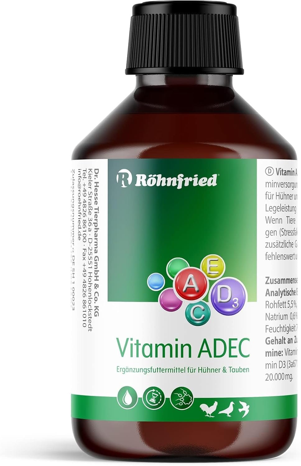 Zusammensetzung: Wasser, Traubenzucker. Analytische Bestandteile: Rohprotein 0,3%, Rohfett 5,5%, Rohfaser 0,0%, Rohasche 1,3%, Natrium 0,6%, Methionin 0,0%, Lysin 0,0%, Feuchtigkeit 78,8%. Gehalt an Zusatzstoffen je 1.000ml: Vitamine: Vitamin A (3a672b) 1.000.000I.E., Vitamin D3 (3a671) 200.000I.E., Vitamin E (3a700) 20.000mg. Antioxidationsmittel: Natriumascorbat (1b301) 50.000mg. Fütterungsempfehlung: Aufgrund des gegenüber Alleinfuttermitteln höheren Gehaltes an Vitaminen darf dieses Ergänzungsfuttermittel bei erhöhten Leistungsanforderungen täglich höchstens mit den aufgeführten Mengen verfüttern werden. Dieses Ergänzungsfuttermittel wird mit dem Tränkewasser verabreicht: Küken: Ca. 2ml pro Liter Trinkwasser. Junghennen/Legehennen: Ca. 1ml pro Liter Trinkwasser. Tauben: 5-10ml pro Liter Trinkwasser. 1 Schraubkappe = 10ml Lagerung: Dicht verschlossen, kühl und vor Licht geschützt! Nach dem Öffnen möglichst innerhalb von 12 Wochen verbrauchen.