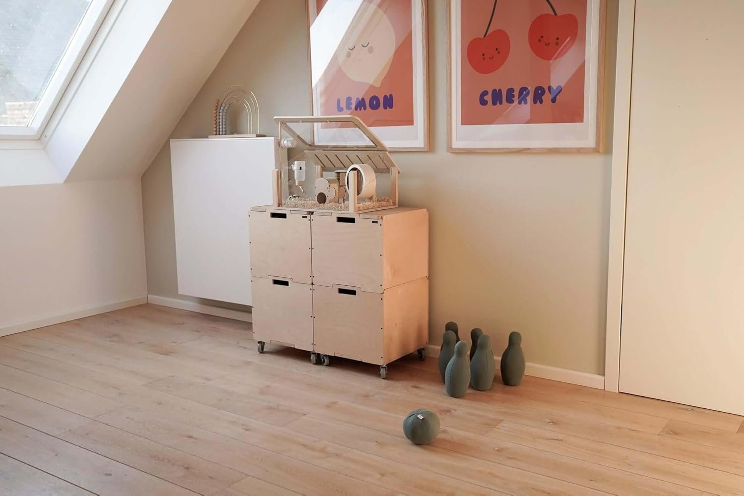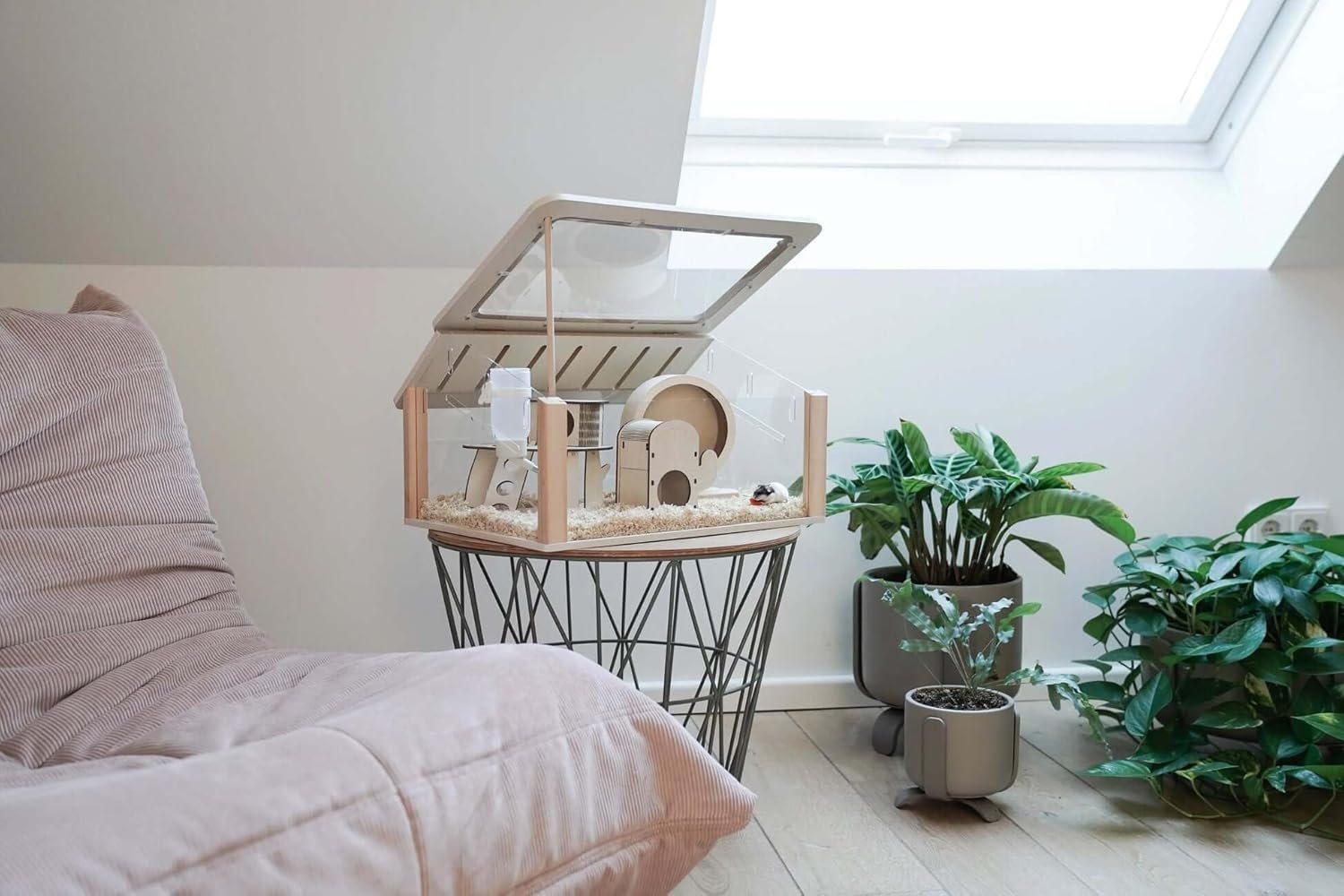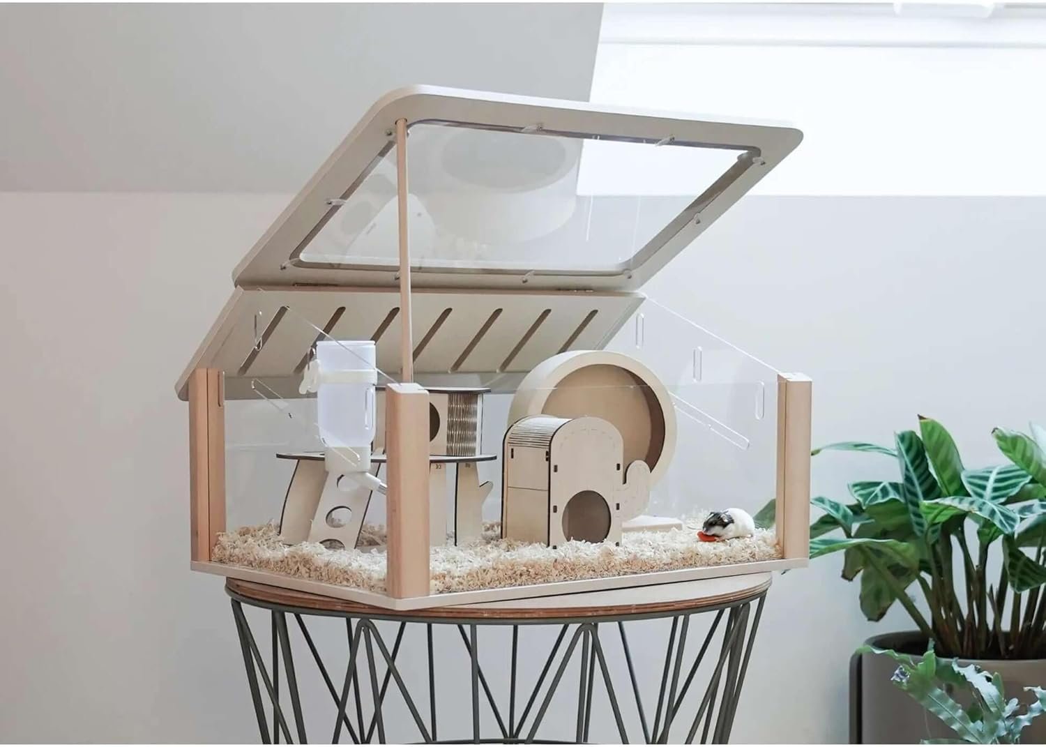 Stilvoller Design-Hamsterkäfig: Modernes und elegantes Design aus Holz und Acrylglas – ein echter Hingucker für jeden Wohnraum und ideal für anspruchsvolle Hamsterliebhaber.