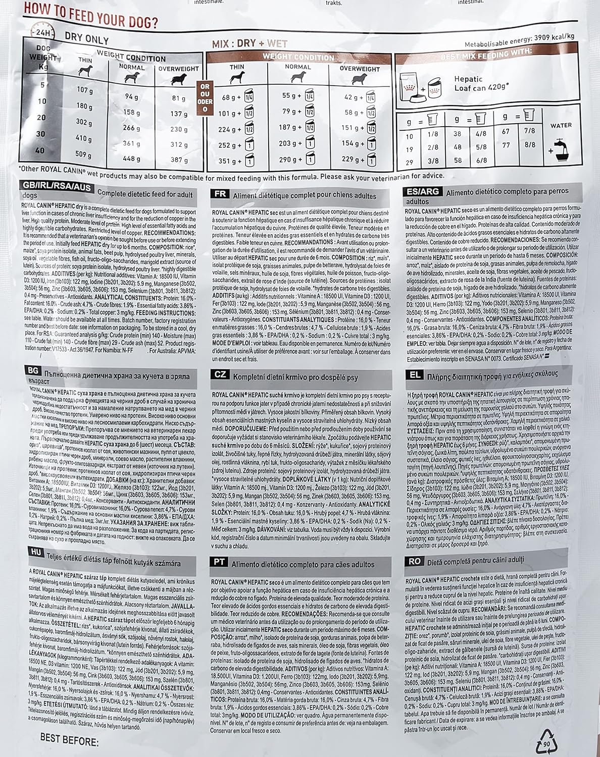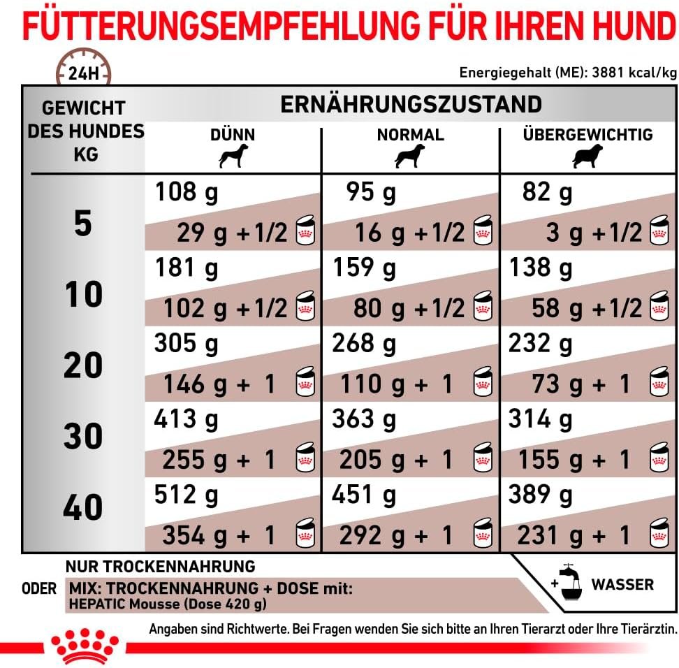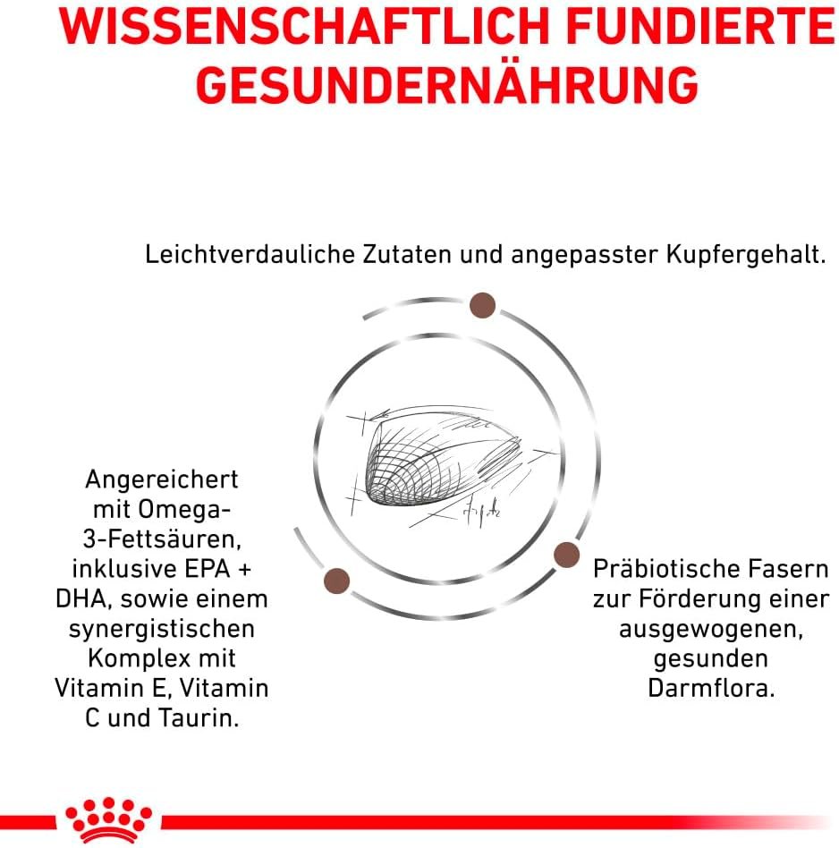 ROYAL CANIN® Veterinary Diet – Hepatic ist ein Alleinfuttermittel für erwachsene Hunde, das zur Unterstützung der Leberfunktion beitragen kann. Das Lebensmittel kann auch bei chronischer Leberinsuffizienz und anderen Lebererkrankungen unterstützend wirken. Bei Erkrankungen der Leber ist eine speziell abgestimmte Ernährung unabdingbar. Dieses Lebensmittel kann auch bei anderen Krankheiten wie chronischer Hepatitis, hepatischer Enzephalopathie und Piroplasmose eingesetzt werden. Pflanzliche Proteine können für eine gute Verträglichkeit sorgen. Ein reduzierter Kupfergehalt in Kombination mit einem hohen Zinkgehalt kann dazu beitragen, die Kupferspeicherung in den Leberzellen zu begrenzen. Eine spezielle Antioxidantien-Kombination kann die Körperzellen zudem unterstützend vor Angriffen aggressiver Stoffwechselprodukte schützen.