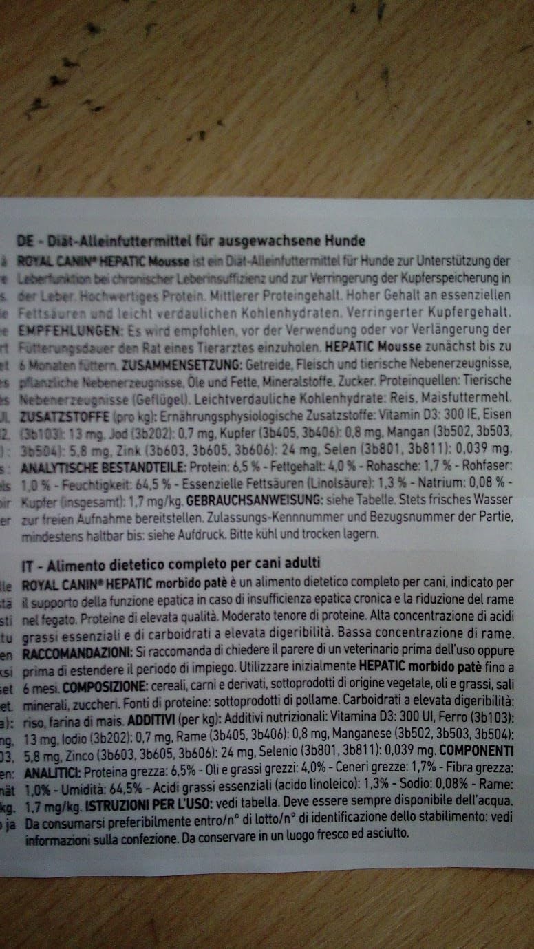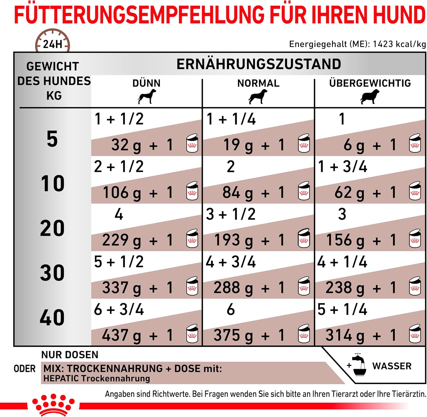 Royal Canin Hepatic Mousse ist ein Nassfutter für Hunde. Diät-Alleinfuttermittel für ausgewachsene Hunde können die Leberfunktion bei chronischem Leberversagen unterstützen. Ein angepasster Gehalt an hochverdaulichen Pflanzenproteinen kann dabei helfen, die Leberfunktion bei chronischem Leberversagen zu unterstützen. Ein niedriger Kupfergehalt kann dazu beitragen, die Kupferretention in Leberzellen zu minimieren. Eine hohe Energiedichte kann dazu beitragen, die zugeführte Nahrungsmenge zu reduzieren und den Verdauungstrakt zu entlasten. Royal Canin® Veterinary Diet – Hepatic Mousse ist ein Alleinfuttermittel für erwachsene Hunde, das bei chronischem Leberversagen und anderen Lebererkrankungen helfen kann. Bei Lebererkrankungen ist eine speziell angepasste Ernährung unerlässlich. Dieses Lebensmittel kann auch zur Unterstützung anderer Krankheiten wie chronischer Hepatitis, Leberenzephalopathie und Pyroplasmose eingesetzt werden.