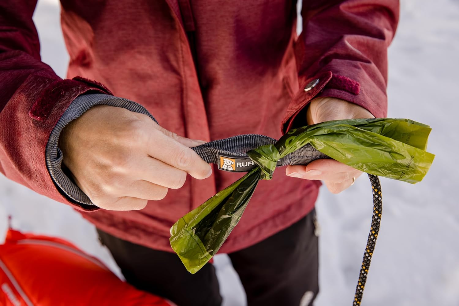 STARK UND VIELSEITIG Starkes Kernmantelseil mit Kern aus wiederverwendeten Restgarnen. Praktische Zubehörschlaufe am Griff für Hundekotbeutel oder Kleinteile zum Anklemmen