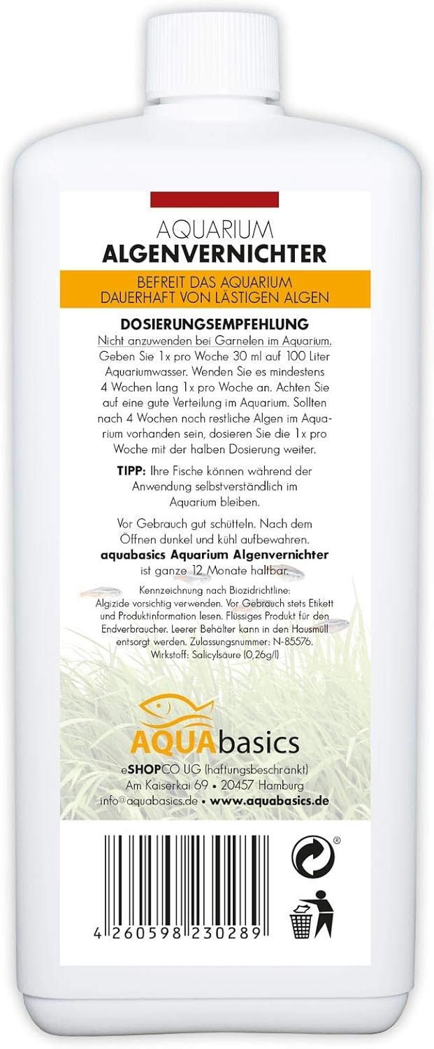 Vor Gebrauch gut schütteln. Nach dem Öffnen dunkel und kühl lagern. Einmal pro Woche 30 ml auf 100 Liter Aquarienwasser geben. Wenden Sie es mindestens 4 Wochen lang einmal pro Woche an. Sorgen Sie für eine gute Verteilung im Aquarium. Sollten sich nach 4 Wochen noch Algenreste im Aquarium befinden, dosieren Sie einmal pro Woche mit der halben Dosierung weiter.