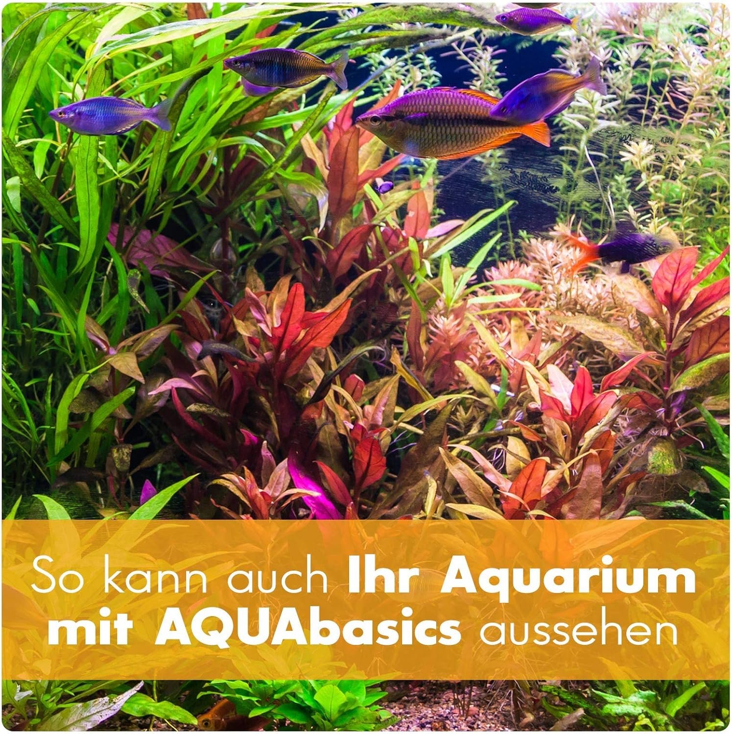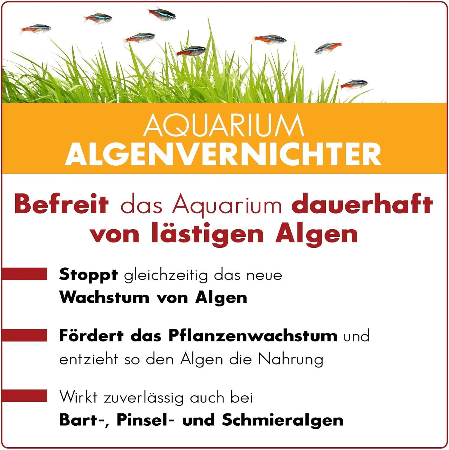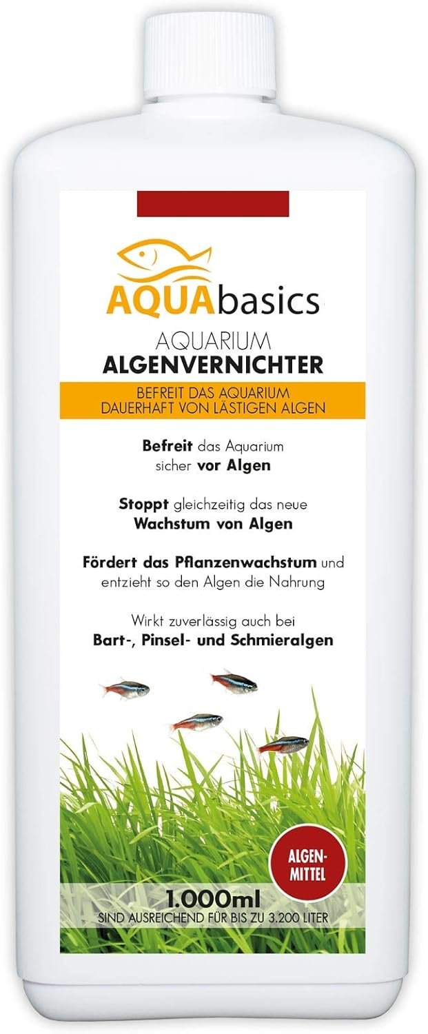 Befreit Ihr Aquarium dauerhaft von lästigen Algen. Aquabasics Aquarium-Algenvernichter befreit Ihr Aquarium mit einer schonenden 4-Wochen-Kur sicher und dauerhaft von lästigen Algen, egal ob Schmieralgen oder wirklich hartnäckige Bart- und Pinselalgen. Durch die Förderung des Pflanzenwachstums nehmen die Pflanzen zusätzliche Nährstoffe auf, die den Algen dann nicht mehr zur Verfügung stehen. Gleichzeitig empfehlen wir die parallele Zugabe von Aquabasics Aquarien-Eisendünger. Dadurch bilden sich die Algen langfristig wieder und die Wasserpflanzen entwickeln sich prächtig.