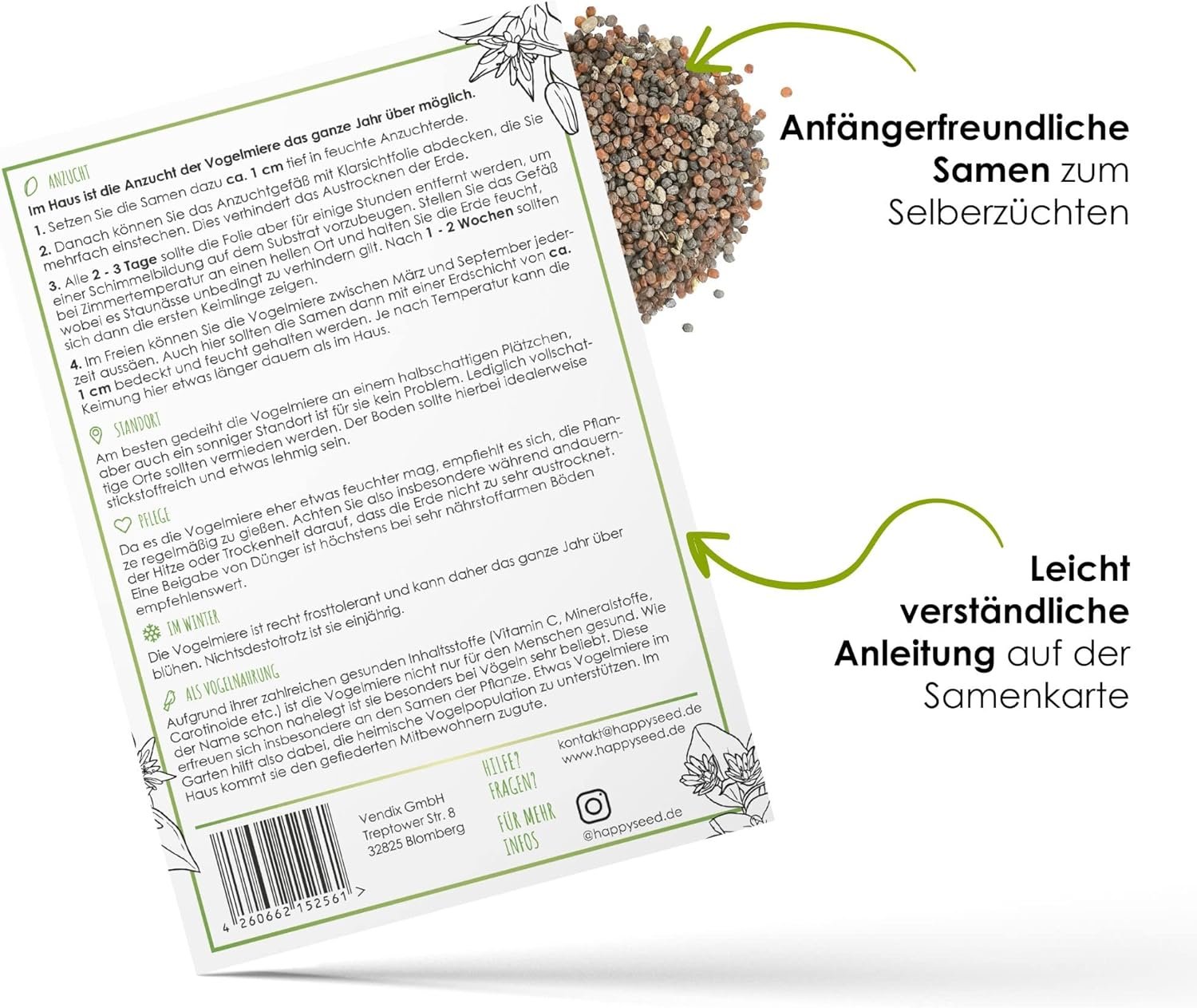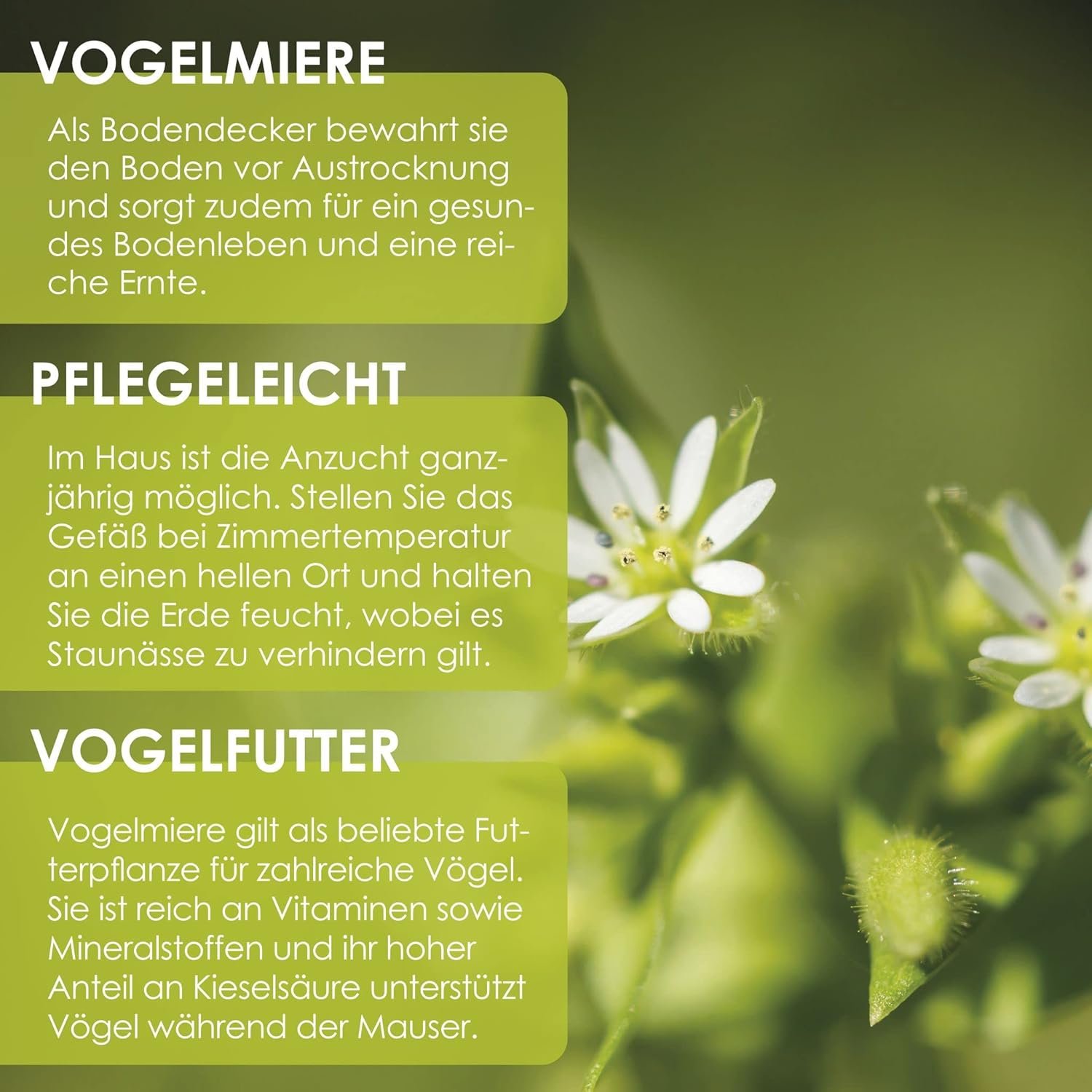 Viele weitere interessante Informationen rund um die Stellaria media finden Sie auf der Rückseite der Samenkarte!