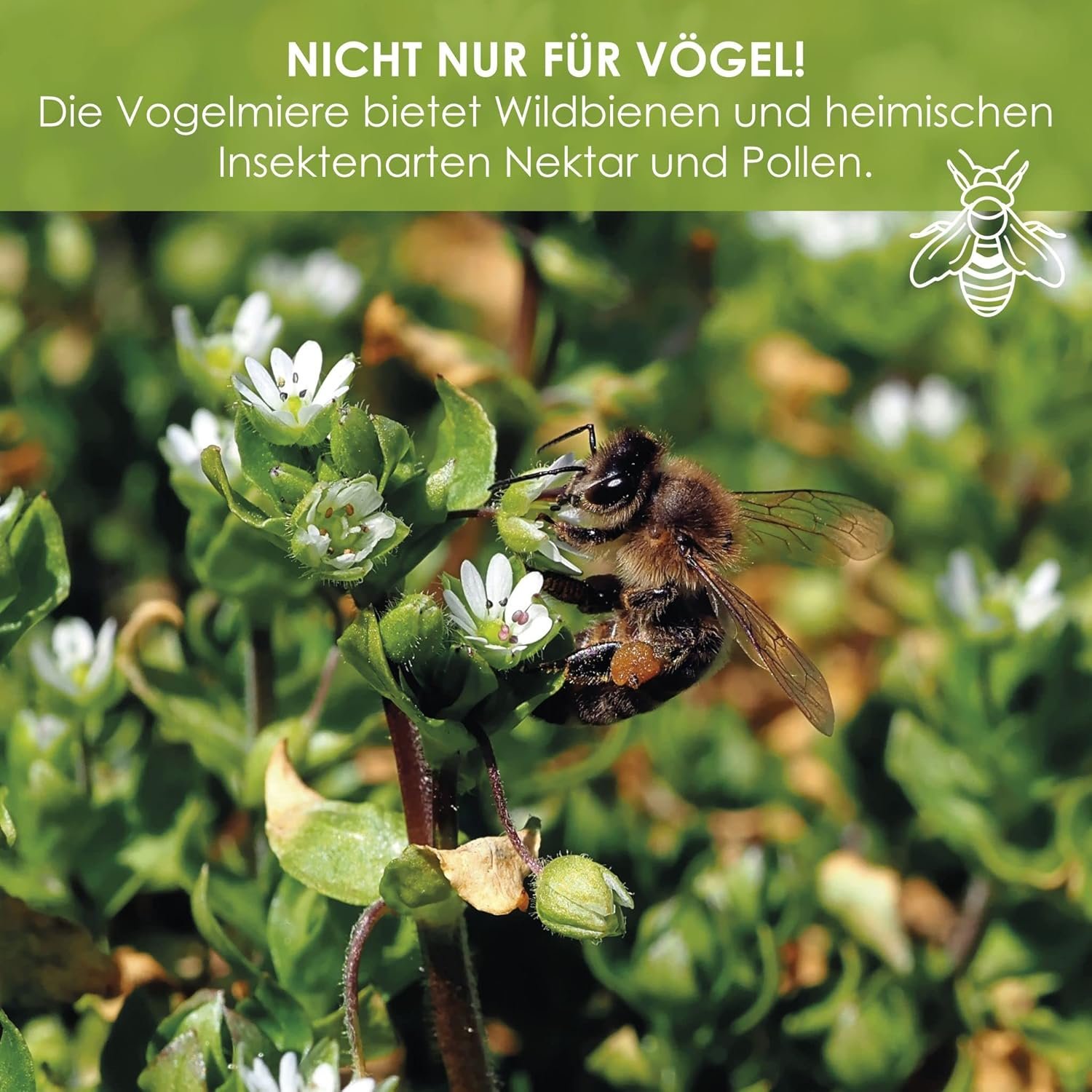 Vogelfutter – Vogelmiere ist eine beliebte Nahrungspflanze für zahlreiche Vögel. Es ist reich an Vitaminen und Mineralstoffen und sein hoher Kieselsäureanteil unterstützt Vögel bei der Mauser.