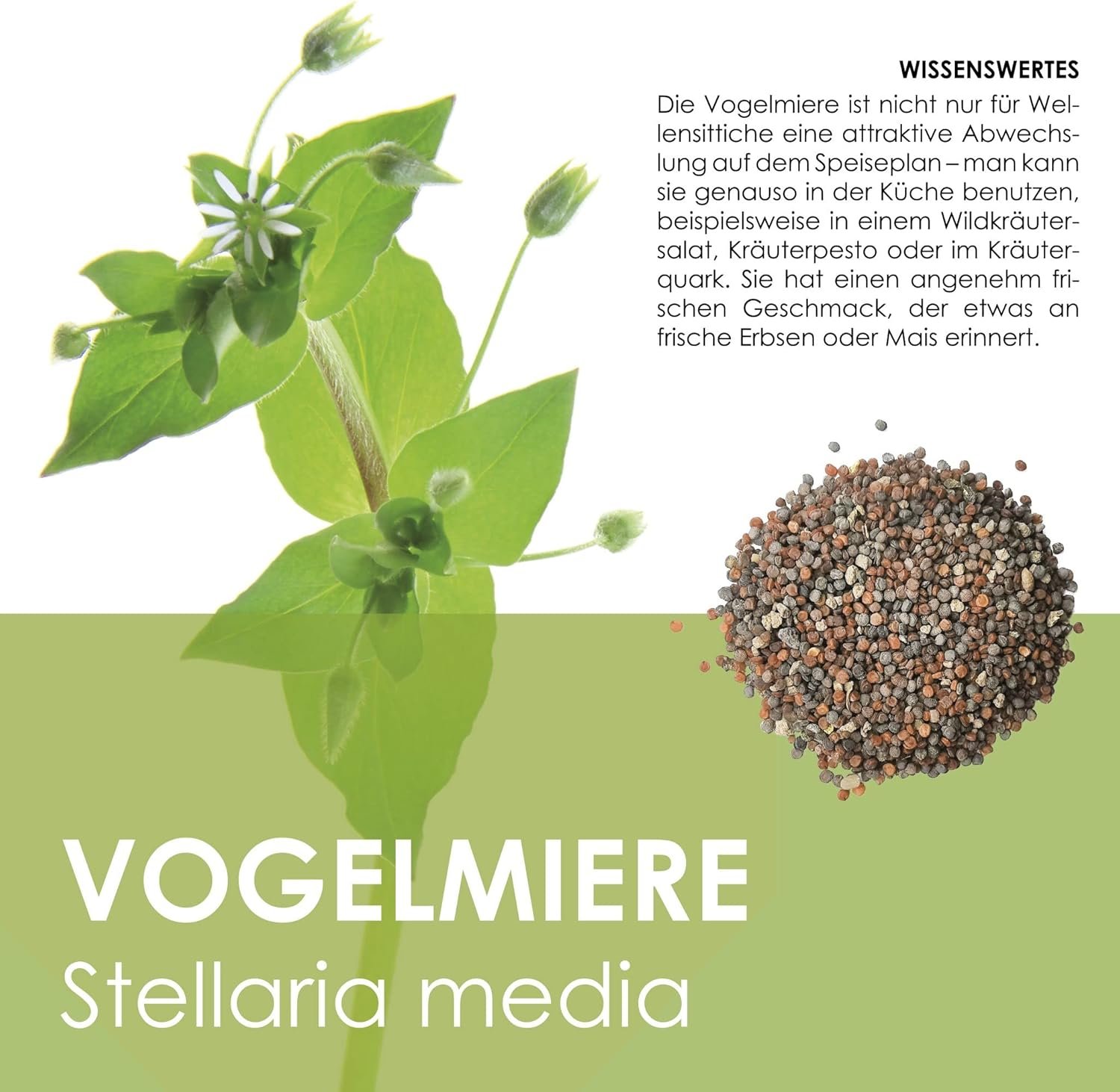 Das Samenpäckchen beinhaltet Samen der Stellaria media. Sie ist nicht nur für Wellensittiche eine attraktive Abwechslung auf dem Speiseplan – man kann sie genauso in der Küche benutzen. Sie hat einen angenehm frischen Geschmack, der etwas an frische Erbsen oder Mais erinnert.