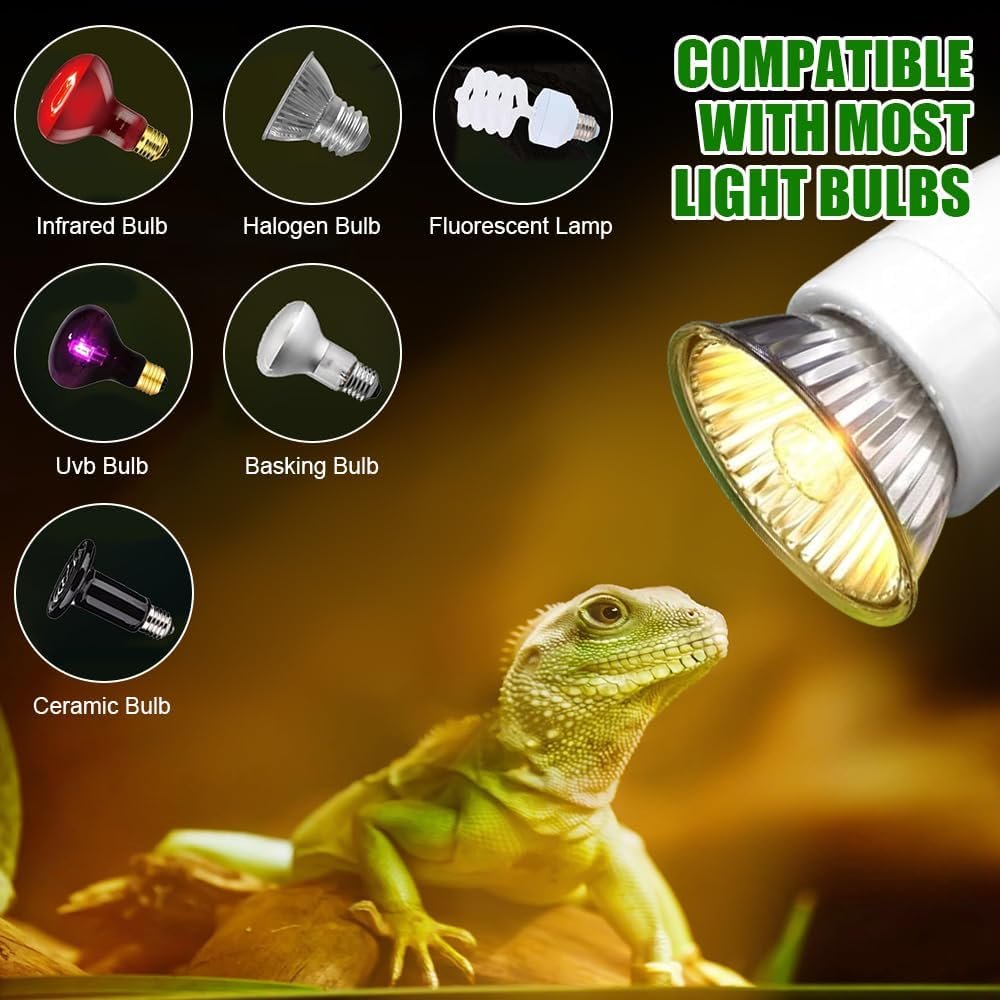 Hitzebeständige Struktur: Schildkröten-Wärmelampe ist so konzipiert, dass sie der hohen Temperatur standhält, die von Reptilien-Heizbirnen abgegeben wird, und ist speziell auf Elastizität ausgelegt. Seine hitzebeständigen Eigenschaften sorgen für einen sicheren Klemm- und Aufhängemechanismus, der die Sicherheit und Gesundheit Ihrer Reptiliengefährten gewährleistet.