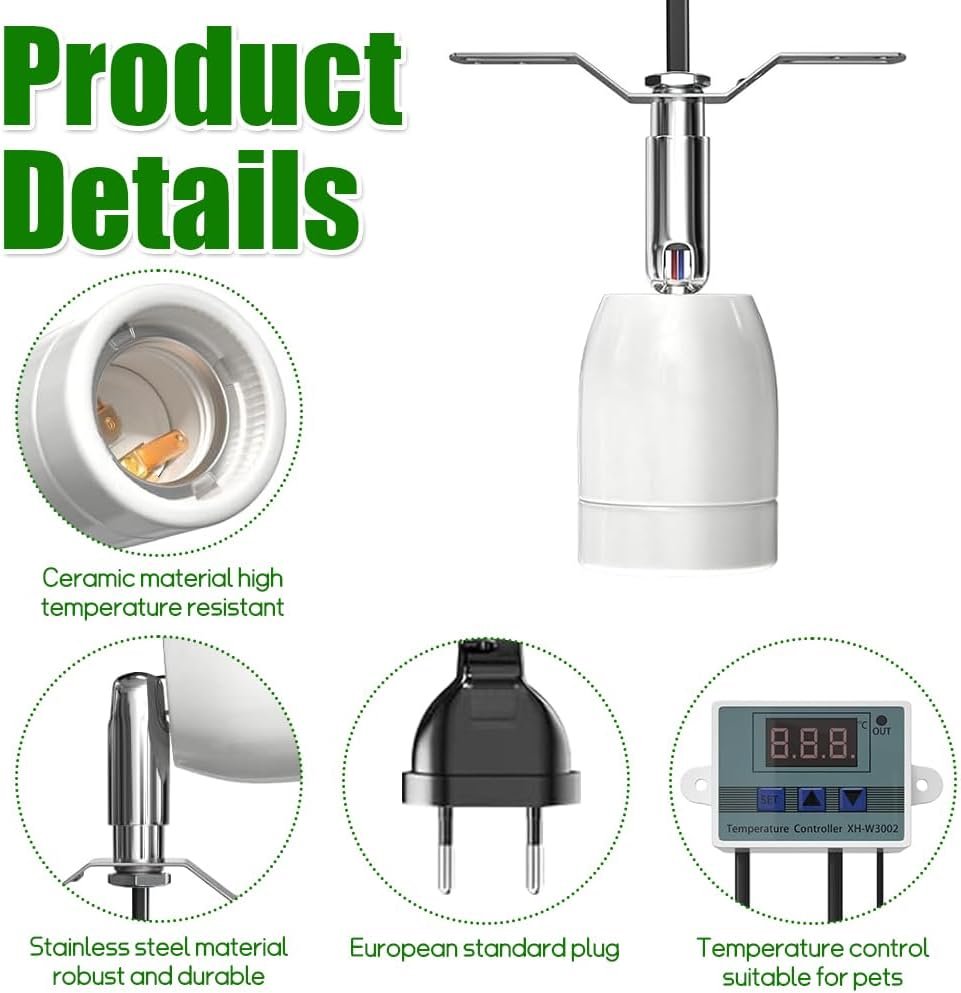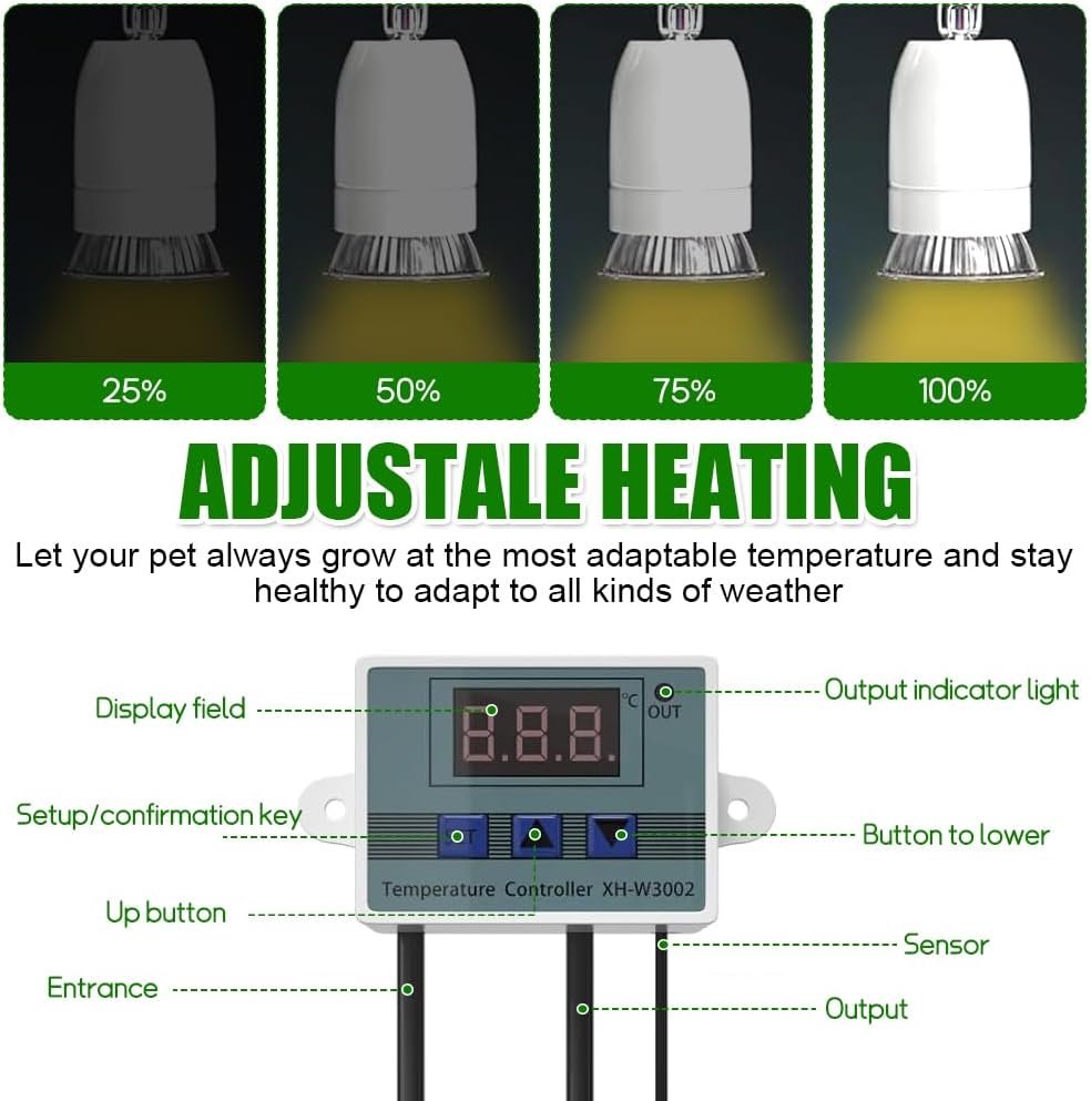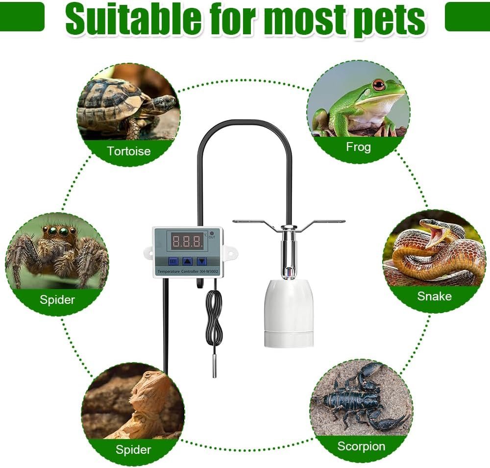 Digitale Temperaturregelung: Der wasserdichte Metallsensor der Schildkröten-Wärmelampe gewährleistet die Erkennung der Umgebungstemperatur und überträgt Informationen an den digitalen Temperaturregler, sodass Benutzer die Temperatur entsprechend den Bedürfnissen von Reptilien anpassen und ein geeignetes Lebensumfeld schaffen können.