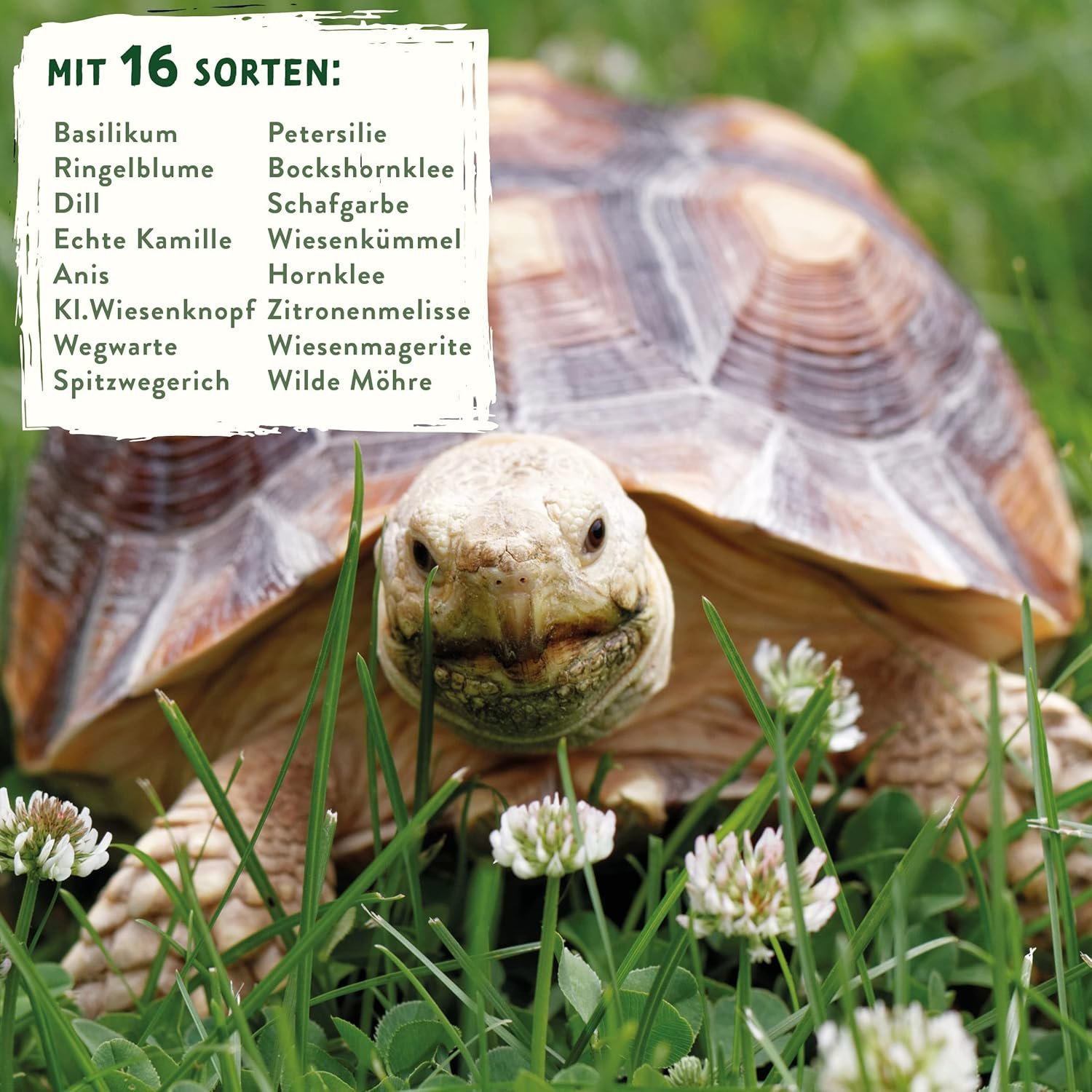 16 köstliche Sorten – in der Schildkrötensamen-Mischung aus Kräutern, Wildkräutern und Blumen enthalten – ideal als Futterpflanzen für Landschildkröten.