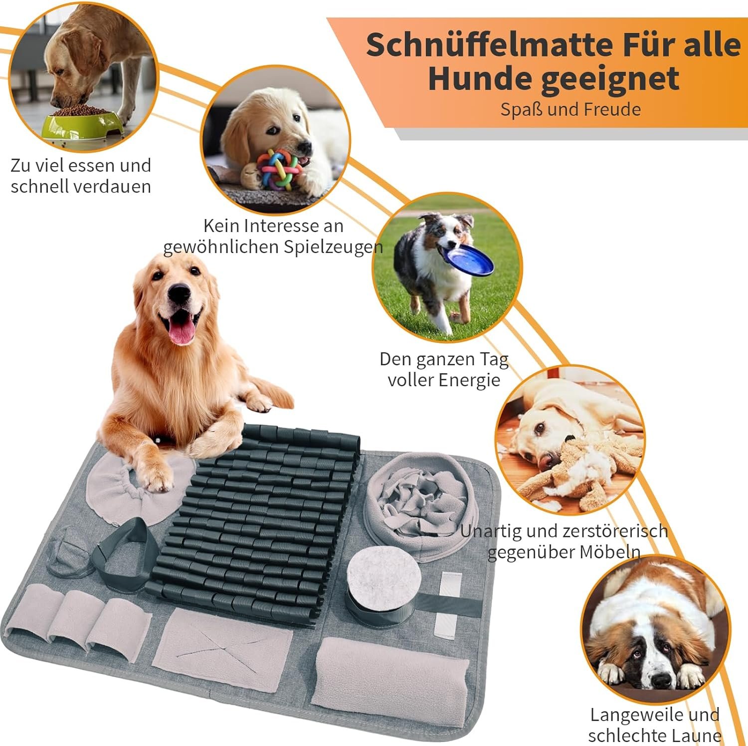 Anwendung: Bei schlechtem Wetter ist es schwierig, mit dem Hund spazieren zu gehen. Mit dieser Schnüffelmatte können Sie Ihr Haustier beschäftigen. Jedes Tier mit Futtersuchinstinkt kann von dieser Schnüffelmatte für Hunde profitieren.