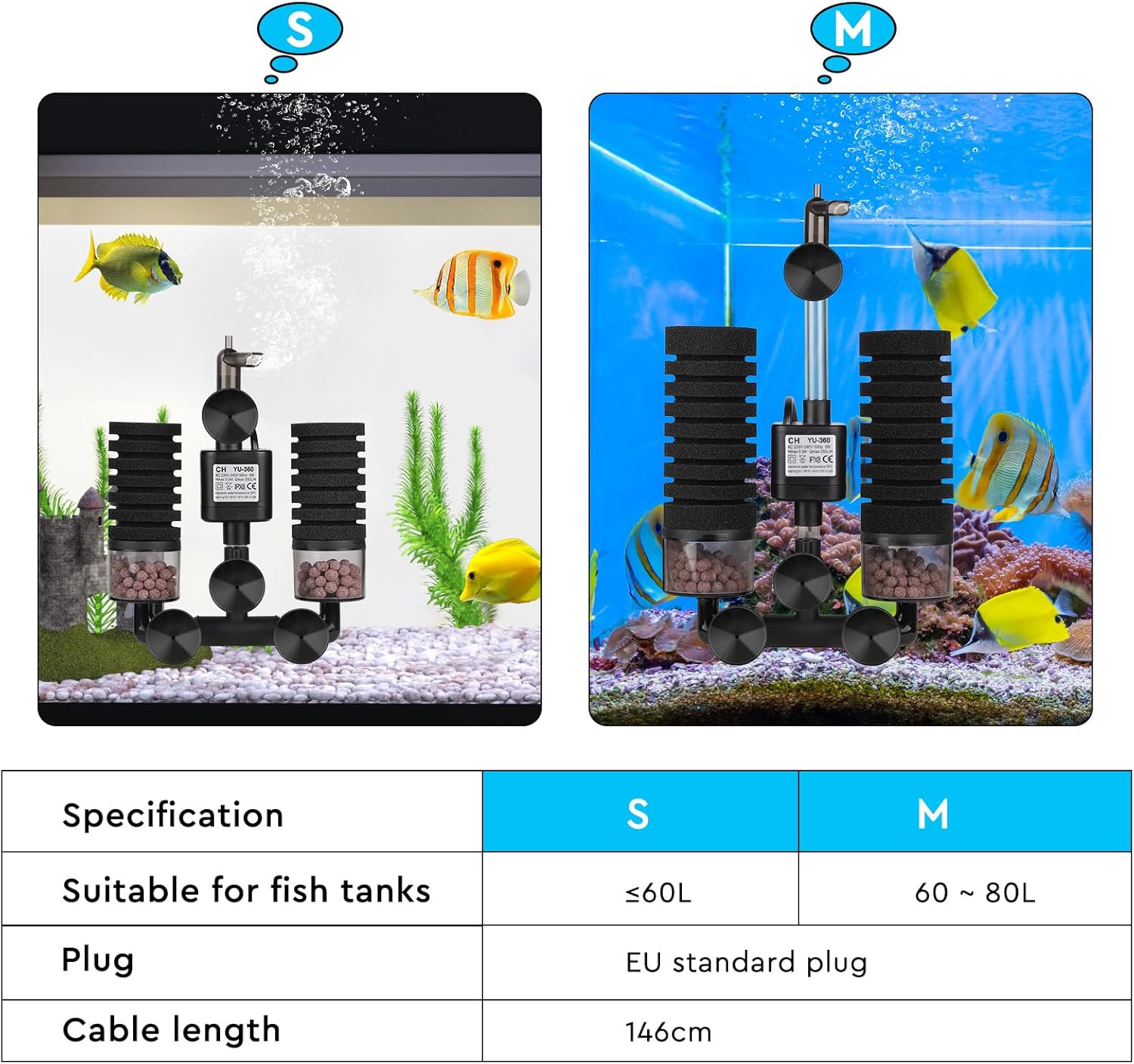 Passende Beckengrößen: Das S-Modell des Aquarienfilters eignet sich für Becken unter 60 Litern, während das M-Modell für Becken von 60 bis 80 Litern geeignet ist. Bitte wählen Sie den passenden Filter entsprechend der Größe Ihres Aquariums aus, um eine gesündere Umgebung für Ihre Fische zu schaffen.