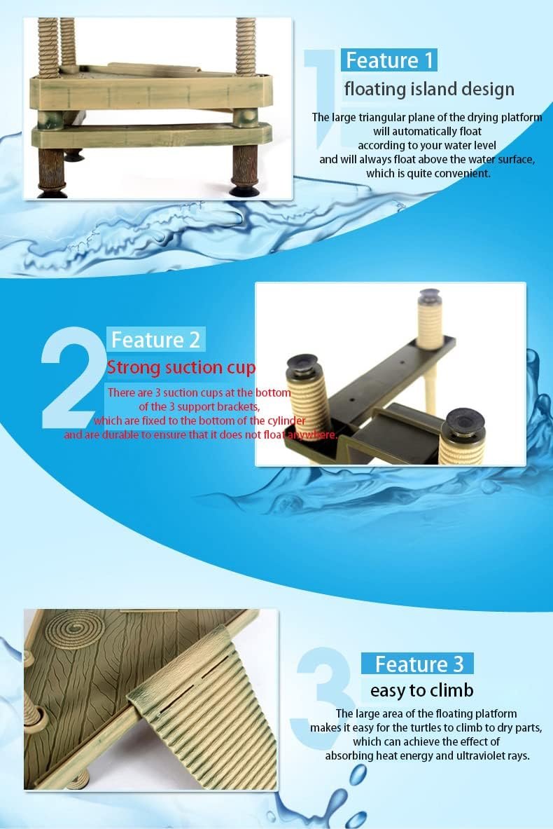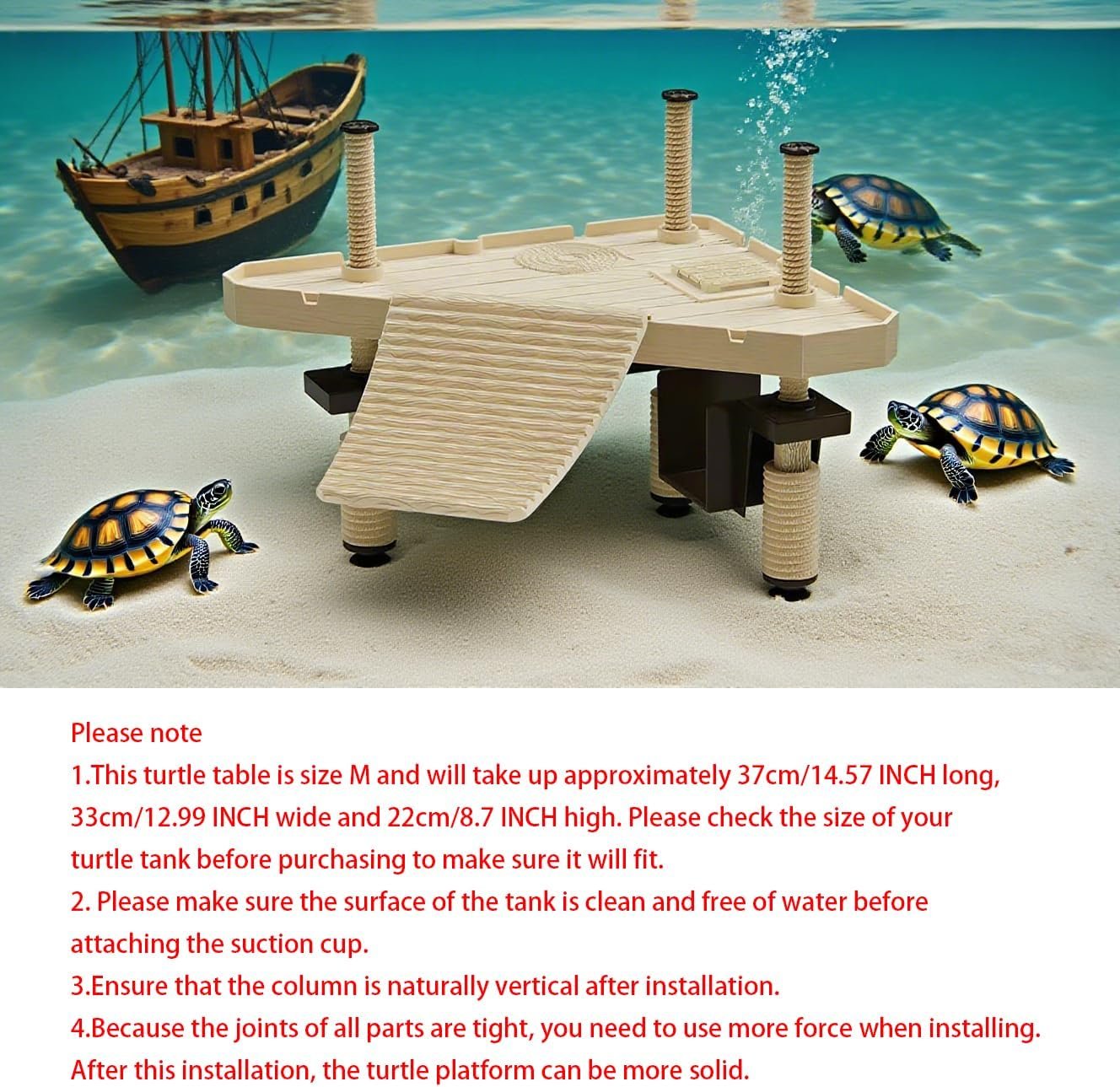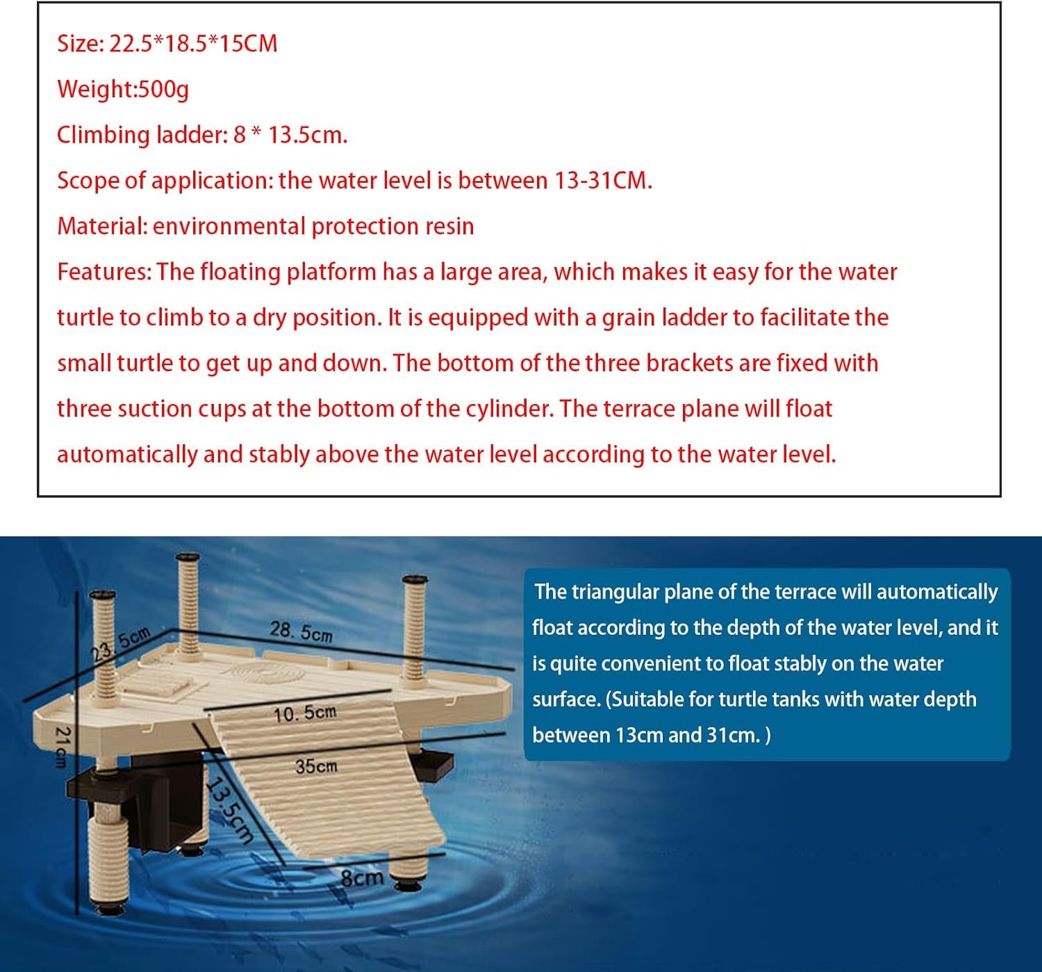 Bitte beachten Sie: 1. Der Platzbedarf dieser Schildkrötenplattform beträgt: 37 x 33 x 22 cm (L x B x H). Bitte überprüfen Sie vor dem Kauf die Größe Ihres Schildkrötenbeckens, um sicherzustellen, dass es hineinpasst. 2. Bitte stellen Sie sicher, dass die Oberfläche des Tanks sauber und frei von Wasser ist, bevor Sie den Saugnapf installieren. 3. Stellen Sie sicher, dass die Säule nach der Installation natürlich vertikal ist.