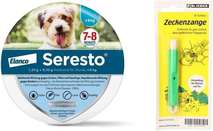 Sobald die Tage wärmer werden, lauern Zecken, Flöhe und Co. zurück in Gärten und Wiesen. Besonders gerne machen sich diese Parasiten über unsere Vierbeiner her. Bei einem Stich können gefährliche Krankheiten mit schwerwiegenden Komplikationen auf das Haustier übertragen werden. Das Seresto-Halsband für kleine Hunde bietet optimalen Schutz vor Zecken und Flöhen für 7-8 Monate – also die gesamte Outdoor-Saison. Die Kombination zweier Wirkstoffe tötet Flöhe und Zecken ab, noch bevor sie das Tier stechen können – und verhindert so die Übertragung gefährlicher Krankheiten. Da der Schutz bereits zwei Tage nach dem Anlegen des Halsbandes einsetzt, empfiehlt es sich, bereits am Hund befindliche Zecken zu entfernen. Die im Set enthaltene Zeckenpinzette verfügt über große Greifer und ermöglicht so ein besonders schnelles und einfaches Greifen und Herausdrehen der Zecke. Das Seresto-Halsband ist wasserbeständig, geruchsneutral und schützt das Tier durch den 2-Phasen-Sicherheitsverschluss vor Verletzungen und Hängenbleiben. Mit einer Länge von 38 cm ist das Halsband besonders für kleine Hunde und bereits ab der 7. Lebenswoche geeignet. Das Halsband eignet sich auch zum Schutz des Hundes auf Reisen, da es das Risiko einer Leishmaniose-Infektion durch den durch Sandmücken übertragenen Erreger Leishmania infantum verringert