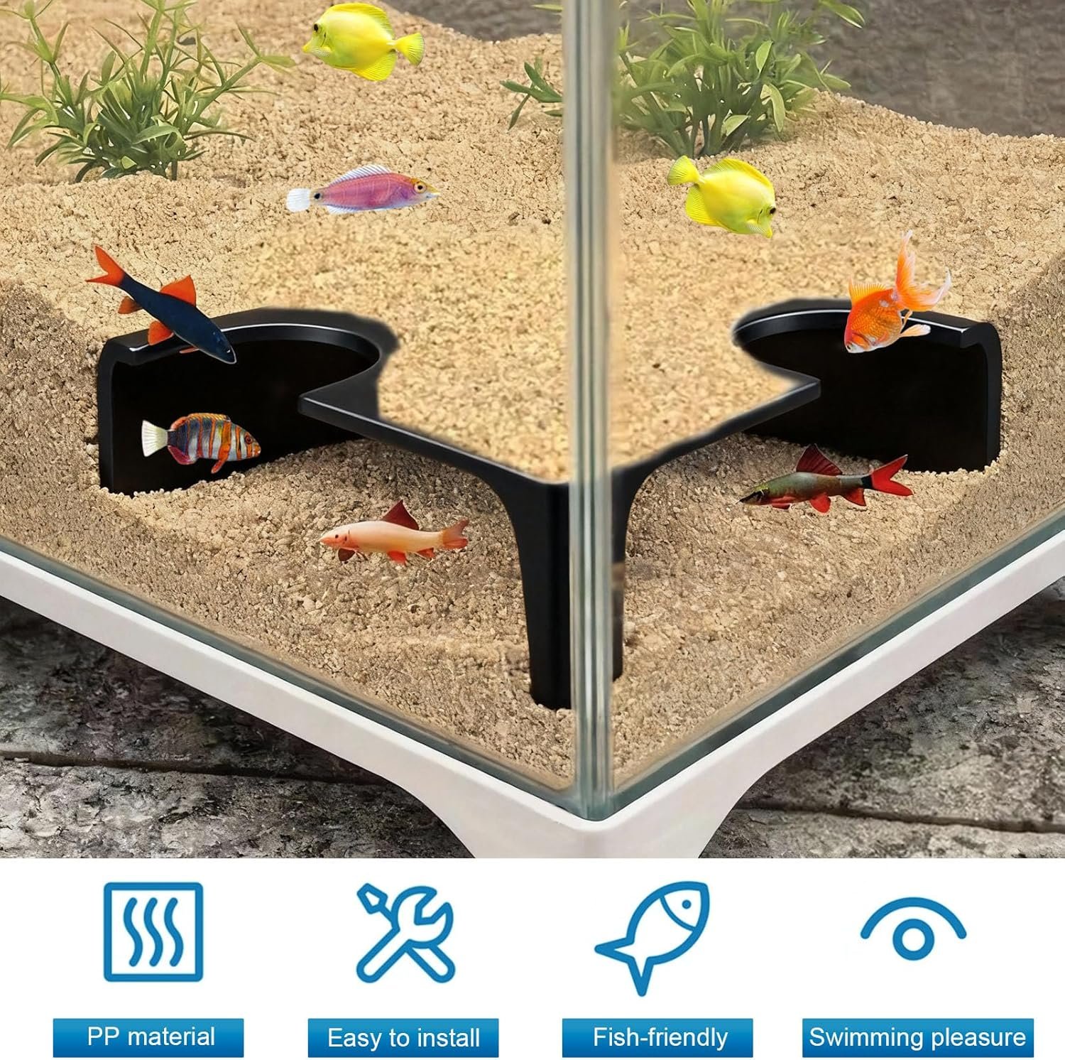 Verhaltenslenkung Der gebogene Kanal fördert die Erkundung des Aquariums durch die Fische und reduziert stereotype Verhaltensweisen, die durch eine eintönige Umgebung entstehen.