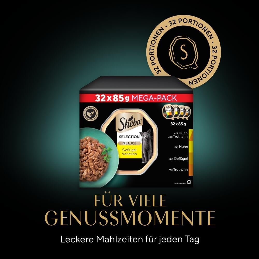 Lieferumfang: 32 x 85 g Sheba Selection in Sauce, Maxipack, Geflügelvariante, Tiernahrung für Hauskatzen, geeignet für Junior ab 12 Monaten bis Senior