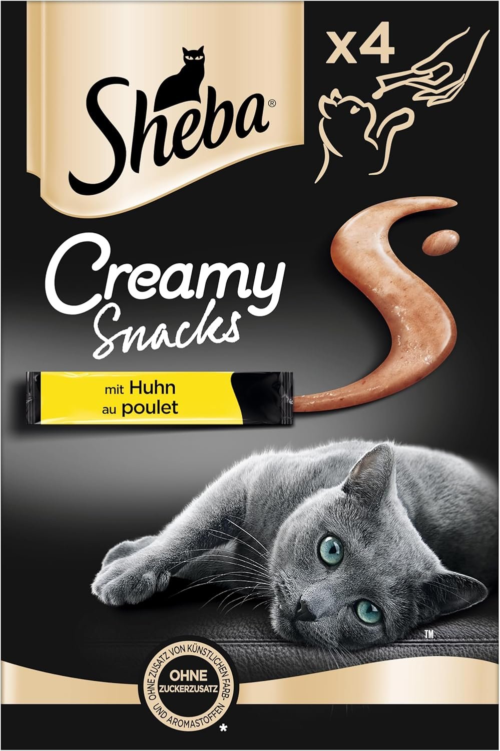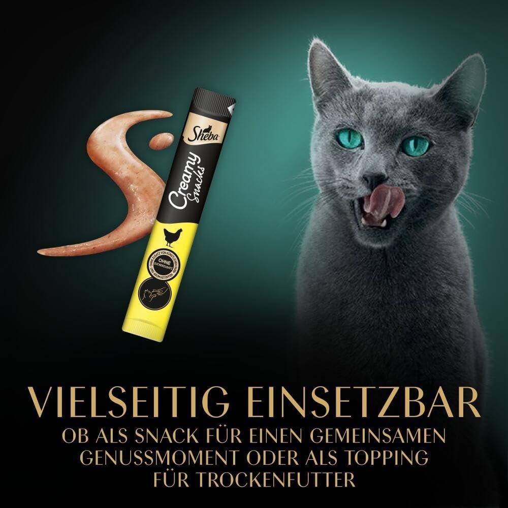 Lieferumfang: 20 Packungen à 4 x 12 g Sheba Creamy Snacks. Großpackung mit Katzenleckerlis in Hühnergeschmack. Auch in den Geschmacksrichtungen Lachs und Rind erhältlich.