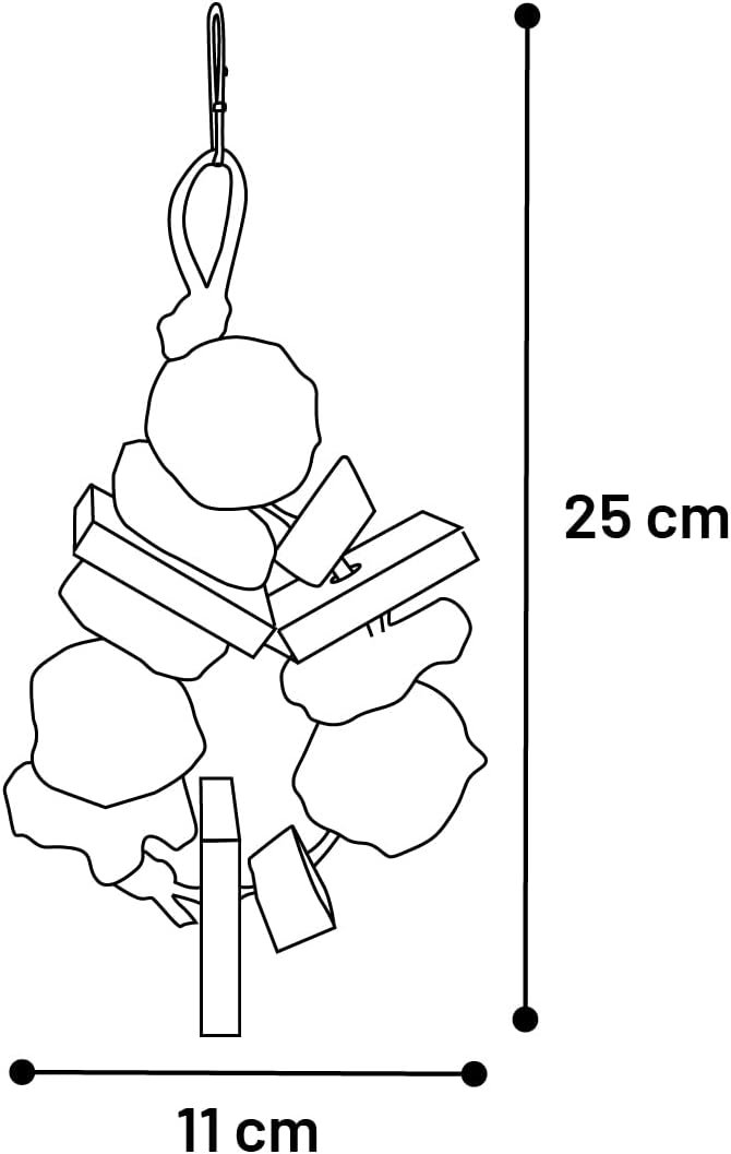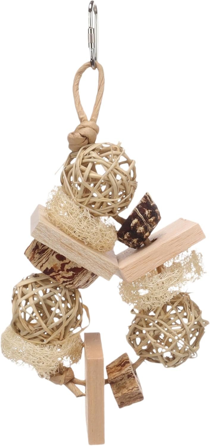 Verwöhnen Sie Ihren Wellensittich mit dem Fem! Käfiganhänger. Hergestellt aus Luffa, Kiefernholz, Mahagoni-Schoten und Rattan und voller lustiger Extras wie Kugeln, Perlen und Seil. Hängen Sie es auf und sehen Sie, wie Ihr Vogel Freude daran hat!
