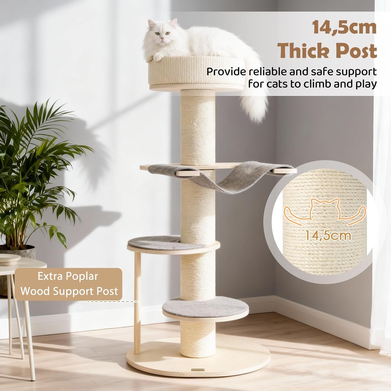 *Verstärkte Kratzbäume aus Sisal* Der Kratzbaum verfügt über dickere und vollständig mit Sisal umwickelte Kratzbäume, die selbst intensiven Kratzattacken standhalten. So kann Ihre Katze ihren Krallen nachgehen, ohne befürchten zu müssen, Ihre Möbel zu beschädigen.