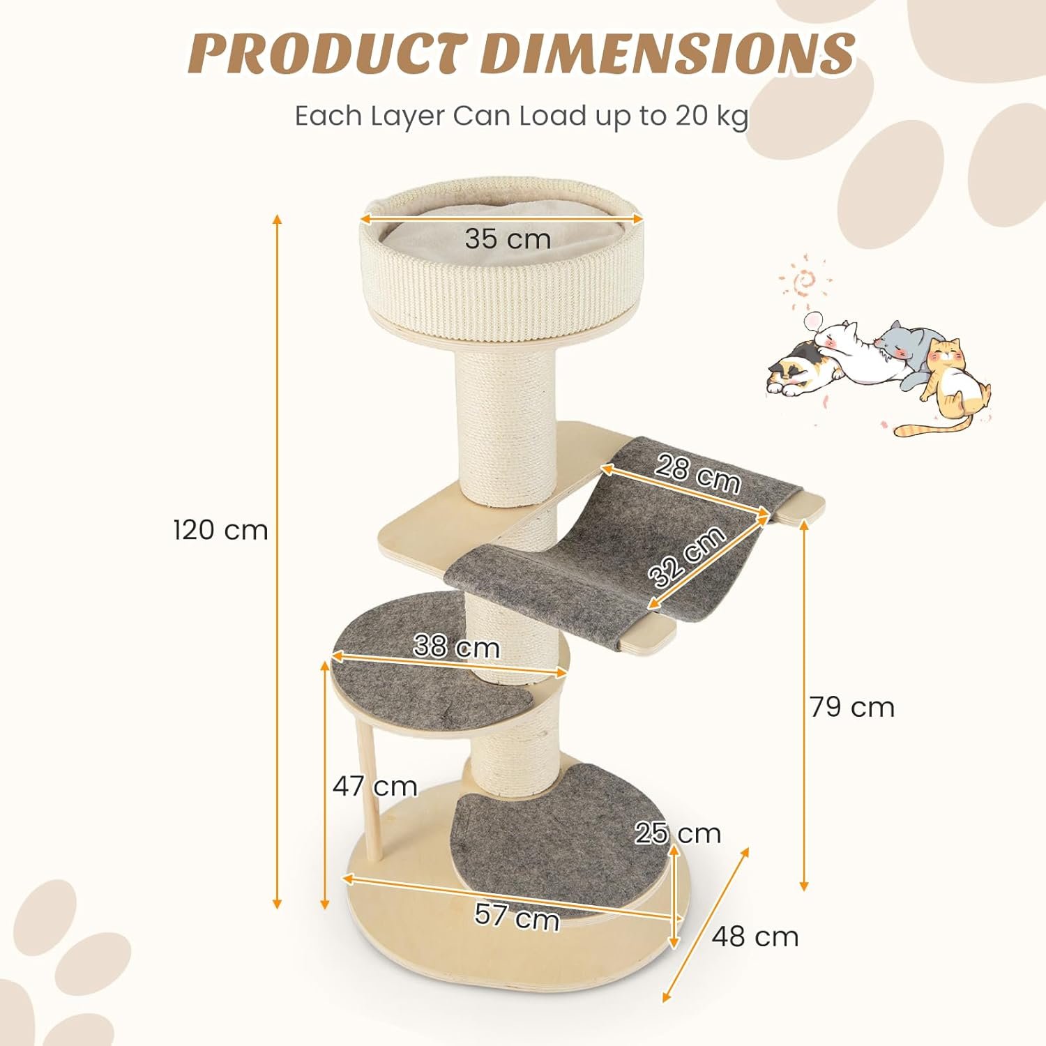 Dieser vielseitige Kratzbaum erfüllt alle Bedürfnisse und Instinkte Ihres Katzenfreundes. Das All-in-One-Katzen-Aktivitätszentrum bietet einen weichen, mit Sisal überzogenen Sitz, sodass Katzen nicht nur bequem ruhen, sondern auch ihre Krallen pflegen können. Die 14,5 cm dicken Sisalstämme sind besonders robust und kratzfest und bieten so einen wirksamen Schutz für Ihre Möbel. Zwei gepolsterte Sprungplattformen ermöglichen Katzen ein spielerisches Klettern und Springen. Darüber hinaus sorgt eine abnehmbare Hängematte aus reißfestem und atmungsaktivem Vliesstoff für einen weiteren gemütlichen Ruheplatz. Der vierstöckige Katzenturm steht dank einer breiten Basis, sechs Anti-Rutsch-Pads und einem zusätzlichen Stützpfosten aus Pappelholz äußerst stabil.