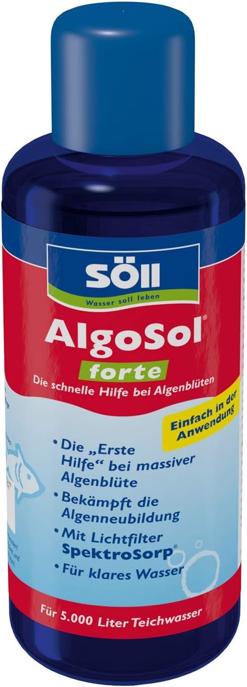 Die Anti-Algenprodukte von Söll wirken gegen alle Algenarten und führen das Algenwachstum auf ein normales Maß zurück. AlgoSol forte wirkt als Erste-Hilfe-Maßnahme extraschnell gegen massive Algenblüte im Teich & hält somit das biologische Gleichgewicht im Teich aufrecht.