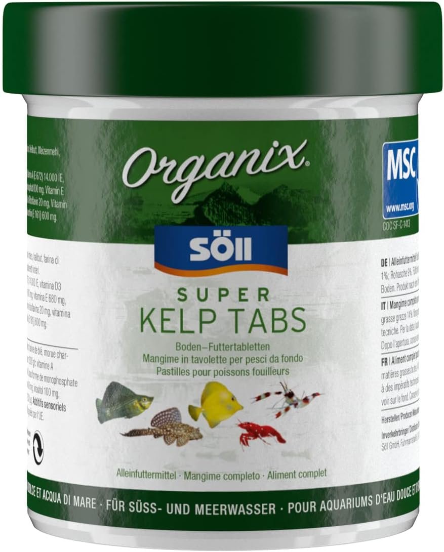 Organix Super Kelp enthält extraviel Kelp und sorgt für eine gesunde Ernährung aller vorwiegend herbivoren (pflanzenfressenden) Zierfische im Süß- und Meerwasser. Aufwuchsfressende afrikanische Cichliden und lebendgebärende Zahnkarpfen lieben dieses Futter besonders.
