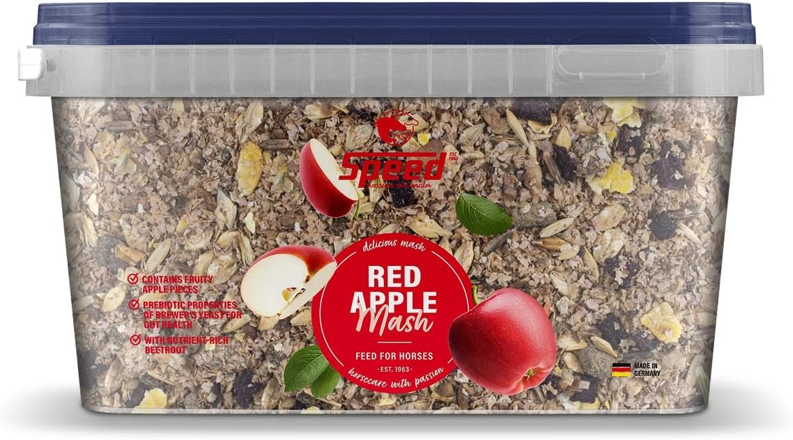 Der „rote“ Mash von Speed eignet sich perfekt zur Ergänzung der bestehenden Futterrationen Ihres Pferdes oder als ausgewogene Belohnung für zwischendurch. Seine vielseitige Formel aus sorgfältig verarbeiteten Zutaten macht das Speed-Mesh-Futter zu einem besonders nahrhaften Snack für jedes Pferd. Das Mash mit getrockneter Roter Bete enthält neben fruchtigen Apfelstücken ein vitalstoffreiches Superfood, das das Pferd mit wertvollen natürlichen Vitaminen und Spurenelementen versorgt. Gut für die Verdauung: Die ausgewogene Formel enthält präbiotische Bierhefe, die eine intakte Darmtätigkeit unterstützen und die Aufnahme von Vitaminen, Mineralstoffen und Spurenelementen verbessern kann. Fütterungsempfehlung: Vor dem Füttern einige Minuten einweichen. Großes Pferd 3 Messbecher Brei mit ca. Mischen Sie 6 Messbecher heißes Wasser. Pony 1 Messbecher Brei mit ca. Mischen Sie 2 Messbecher heißes Wasser. Je nach gewünschter Konsistenz mehr Wasser hinzufügen. Ein Messbecher (200 ml) entspricht ca. 70 g Maische.