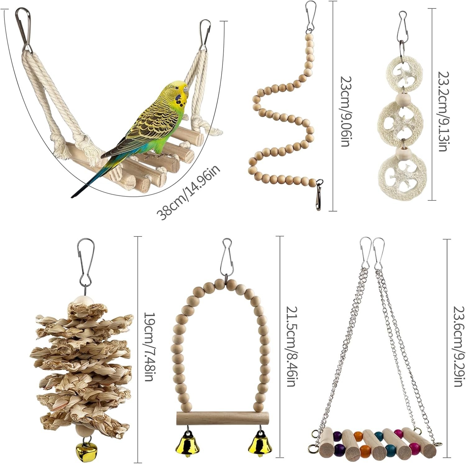 Sicheres Material: Die meisten unserer Vogelkäfigspielzeuge bestehen aus Holz, Rattan, Luffa und Schilfrohr, was für Ihren Vogel sehr gut und sicher zum Kauen und Spielen geeignet ist.