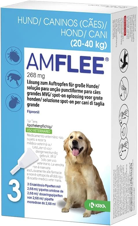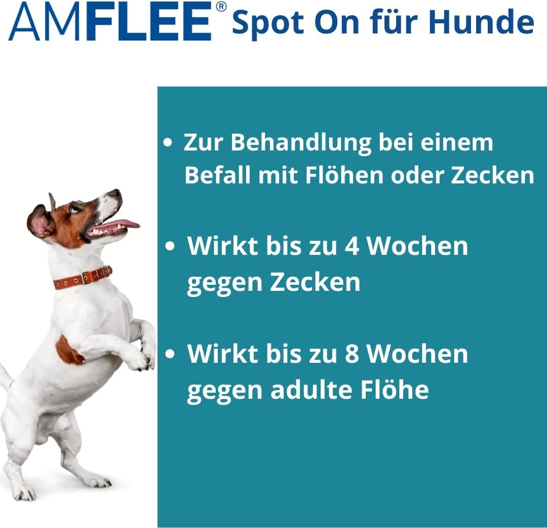 Floh- und Zeckenschutz für Hunde: AMFLEE für Hunde dient zur Behandlung eines Befalls mit Flöhen oder Zecken, zur Behandlung eines Haarlausbefalls bei Hunden