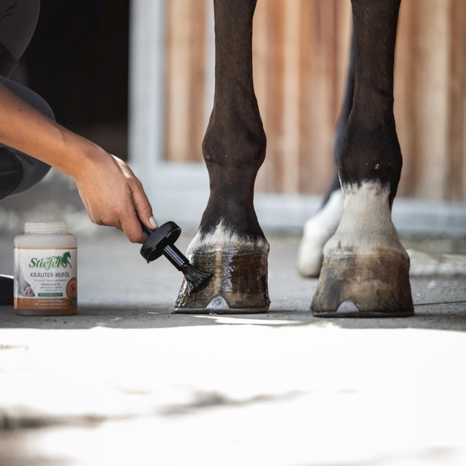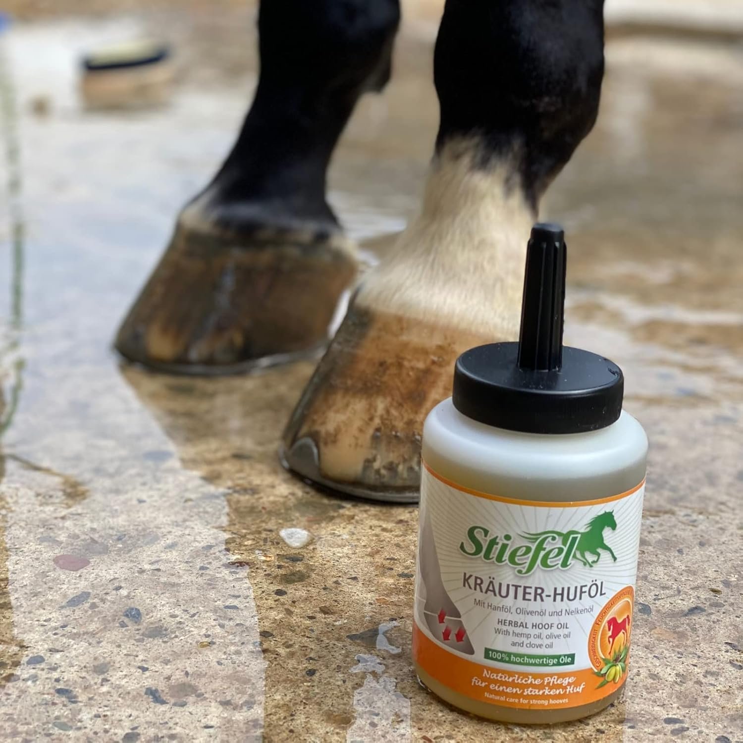 Tipp: Bei feuchten Hufen zieht das Kräuter-Huföl besonders gut ein.