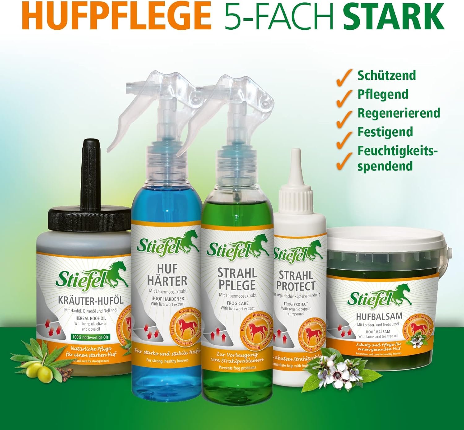 Hufpflege 5-fach stark: Egal wo das Problem liegt – Stiefel hat das richtige Produkt: zum Schutz, zur Unterstützung oder einfach zur natürlich sanften Pflege.