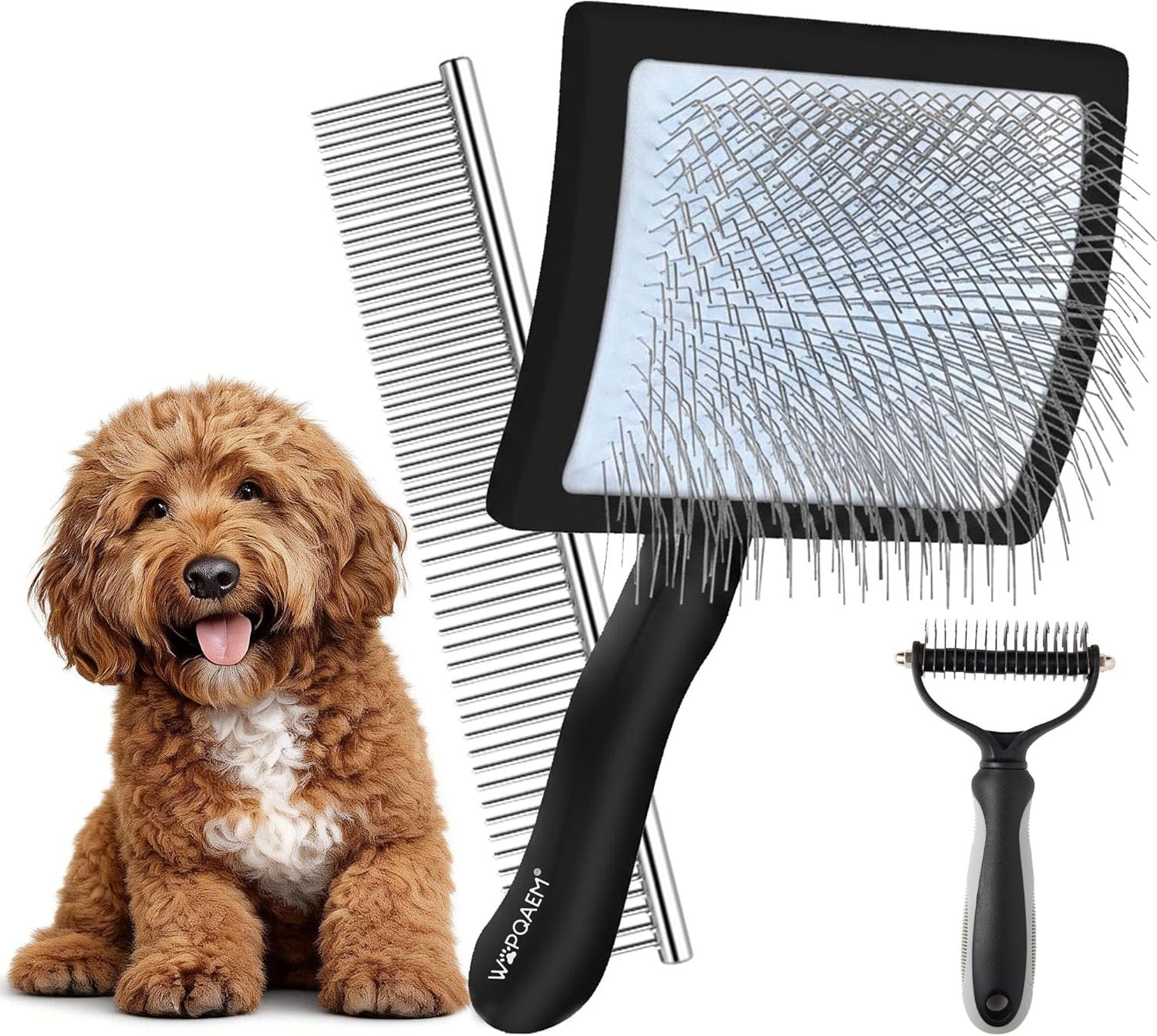WOPQAEM Slicker Dog Brush – Diese hochwertige Bürste entfernt effektiv Unterwolle und Knoten, ideal für langhaarige Hunde wie Pudel, Goldendoodle, Labradoodle und Cockapoo. Es sorgt für ein glänzendes, gesundes Fell ohne Hautirritationen. Als Bonus erhalten Sie einen Edelstahlkamm sowie einen Hundeunterfellrechen.