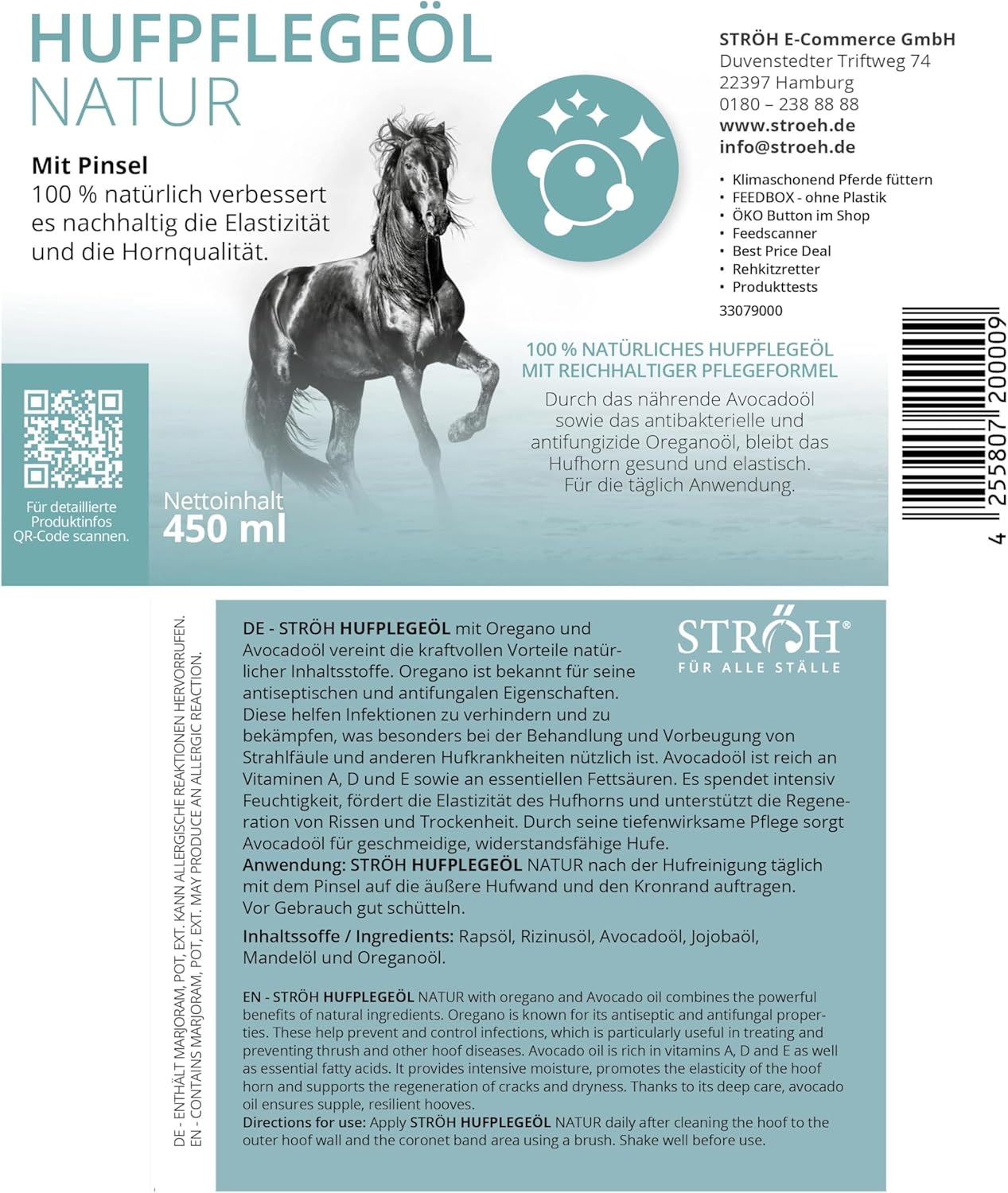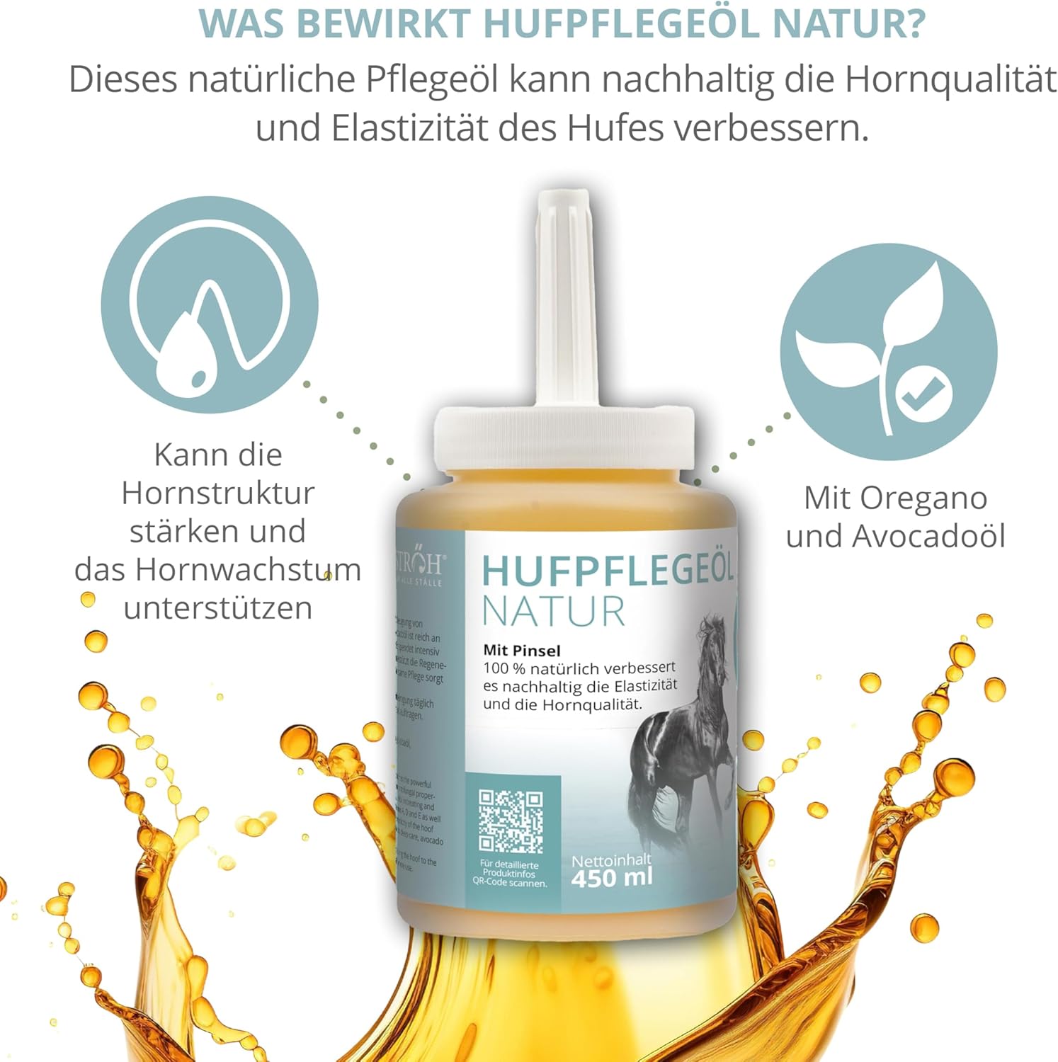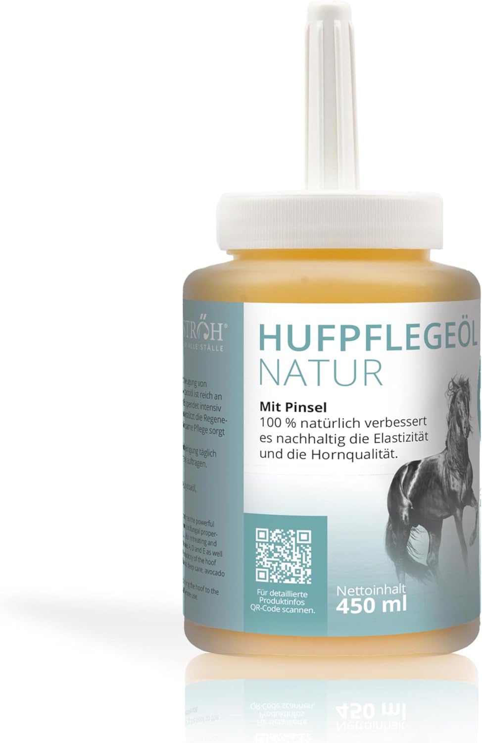 Pferdehufpflege mit natürlichen Pflegeölen – STRÖH Huföl natur pflegt trockene und spröde Hufe mit Rapsöl, Rizinusöl, Avocadoöl, Jojobaöl, Mandelöl und Oreganoöl. Das natürliche Huföl kann die Hornqualität und Elastizität der Hufe nachhaltig verbessern.