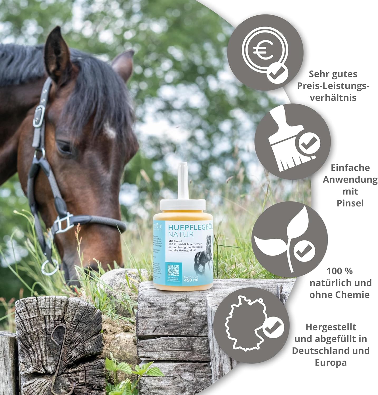 Einfache und schnelle Anwendung – Tragen Sie den Hufbalsam täglich mit dem Pinsel auf die gereinigte Hufwand und den Kronenrand auf. Das Huföl zieht schnell ein, klebt nicht und schützt zuverlässig – ideal für die regelmäßige Hufpflege.